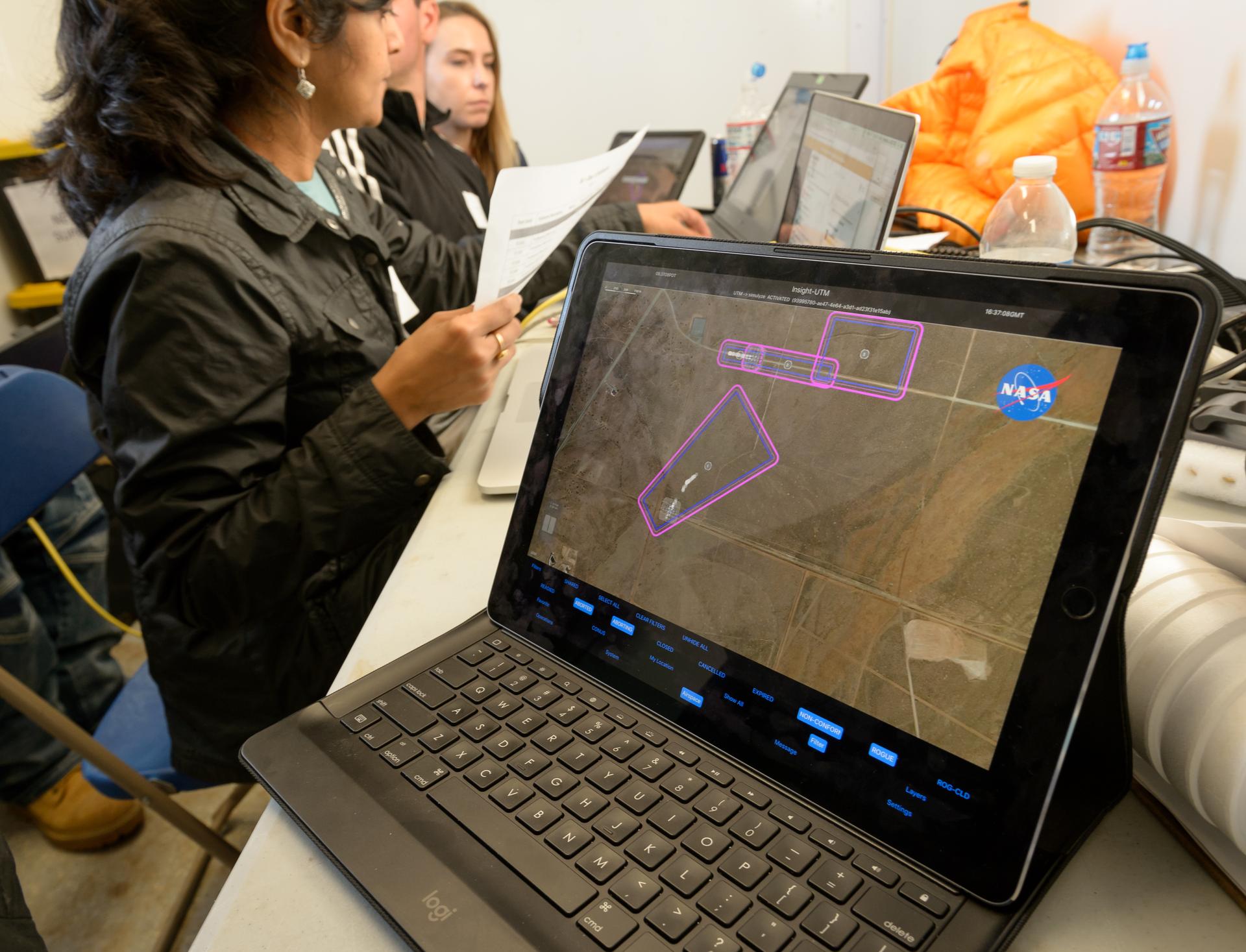 Test of Unmanned Aircraft Systems Traffic Management (UTM) technical capability Level 2 (TCL2) at Reno-Stead Airport, Nevada. During the test, five drones simultaneously crossed paths, separated by altitude. Two drones flew beyond visual line-of-sight and three flew within line-of-sight of their operators.