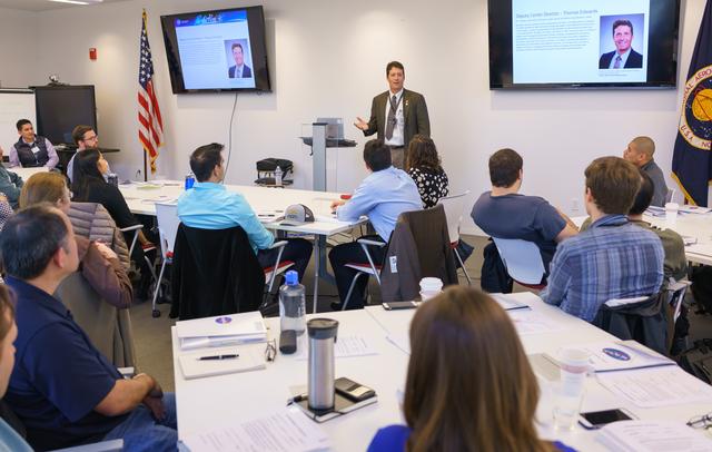 New Employee Orientation swearing-in N-232. Tom Edwards, Ames Deputy Director address the group.