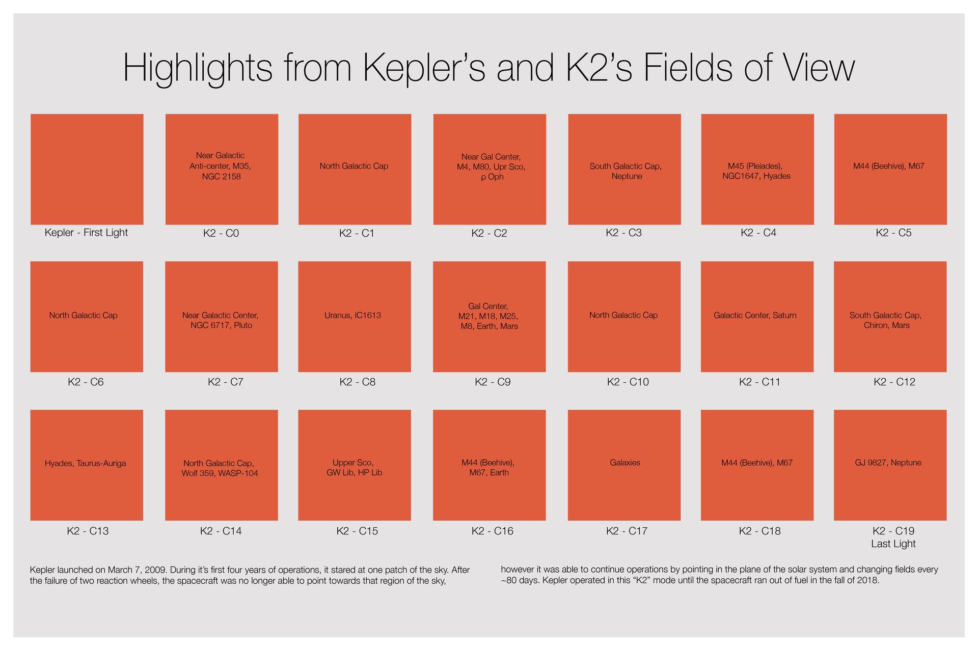 The Kepler space telescope examined twenty-one patches of the sky during it’s nine and a half years of operation. Within these regions, Kepler gathered high precision brightness measurements of over half a million stars facilitating the discovery of thousands of exoplanets and yielding insight into a multitude of other astrophysical phenomena. Illustration by Wendy Stenzel. Science content: Jeff Coughlin, Kenneth Mighell, Doug Caldwell, all of NASA Ames. Key words: Kepler, K2, Missions, nasa, Ames research center, spacecraft, FFI, Full Frame Image, fields of view, science.