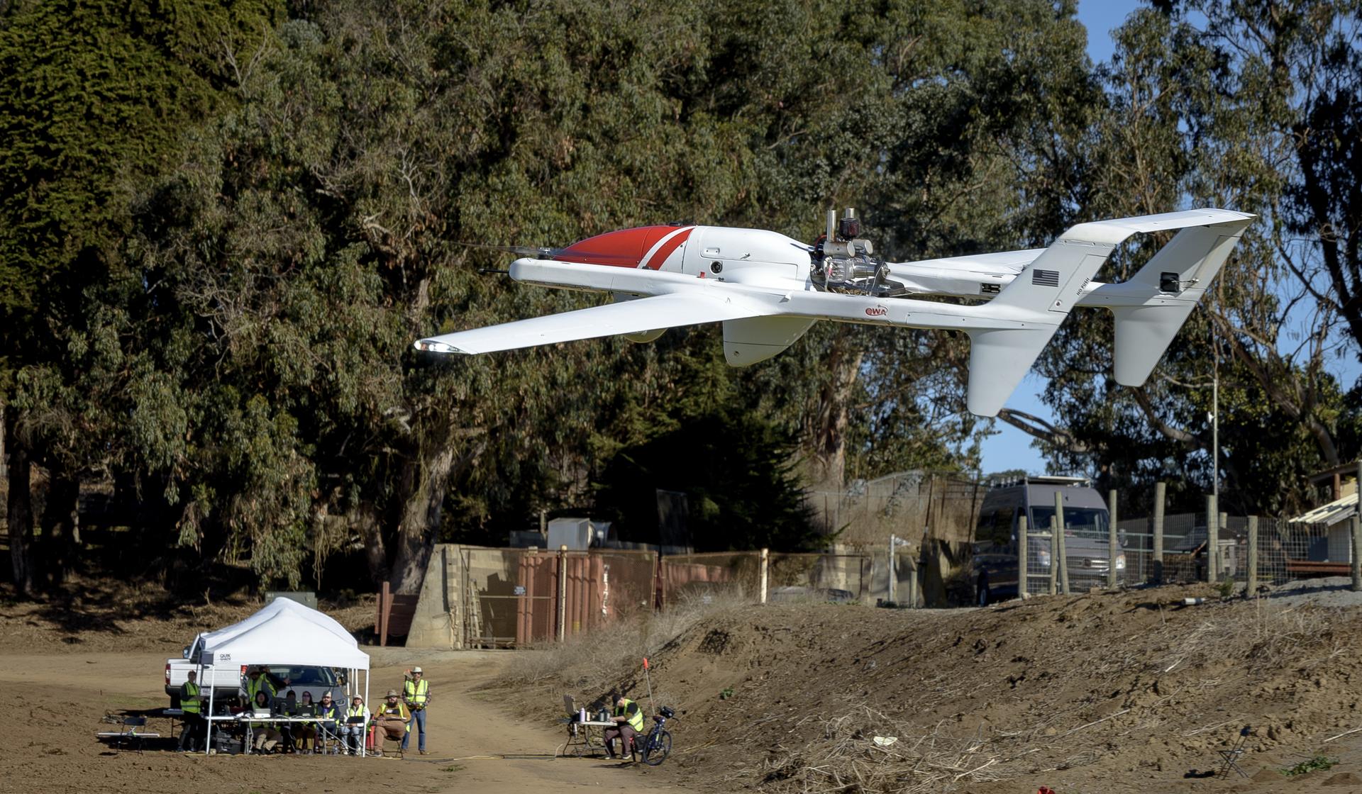 L3Harris FVR90 Unmanned Aerial Vehicle (UAV) lifts off from the Monterey Bay Academy Airport near Watsonville, California, during the Advanced Capabilities for Emergency Response Operations (ACERO) Shakedown Test as NASA researchers observe in the background.