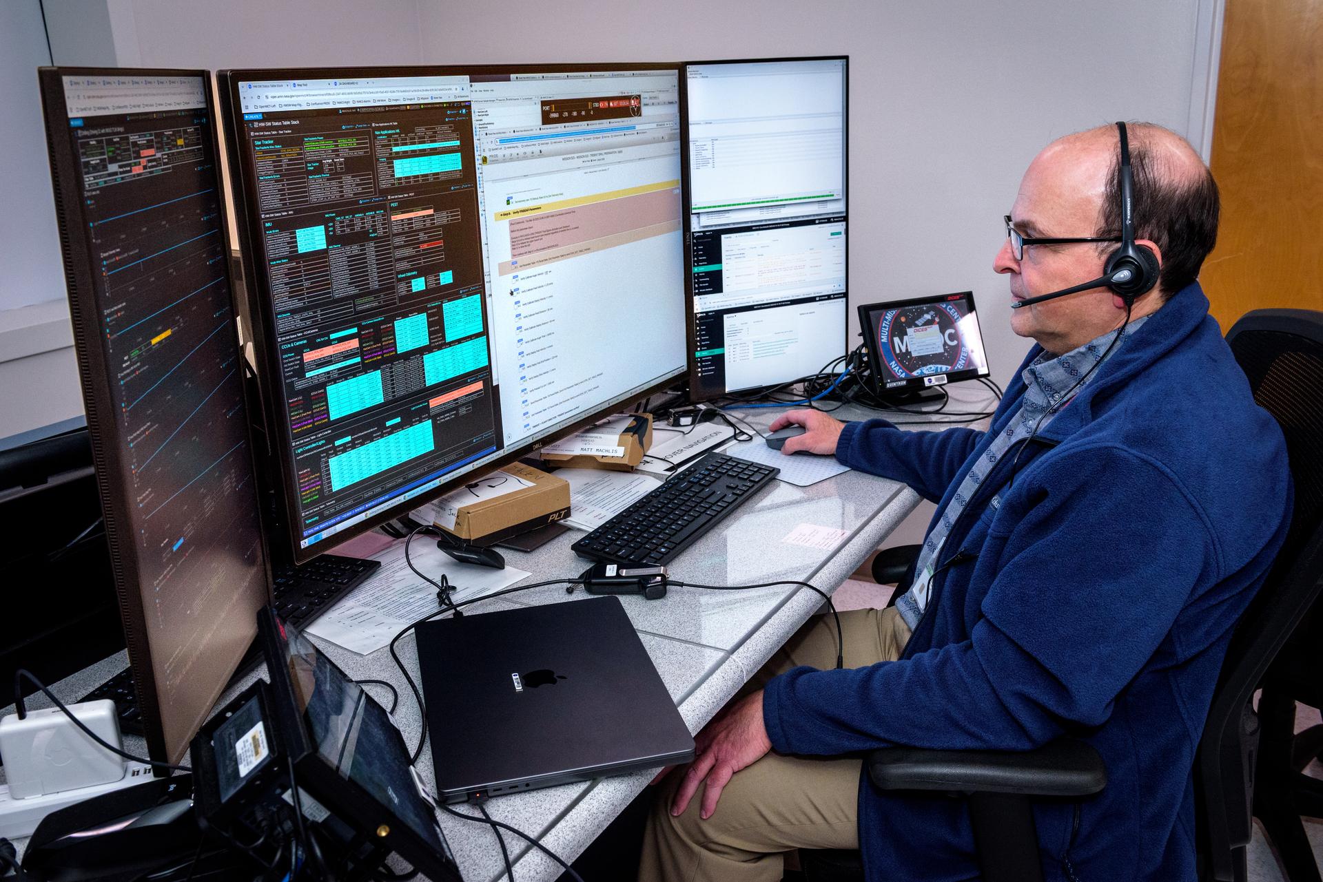 Matt Machlis during the Volatiles Investigating Polar Exploration Rover (VIPER) vehicle operational readiness test in the Multi-Mission Operations Center (MMOC), N240A.