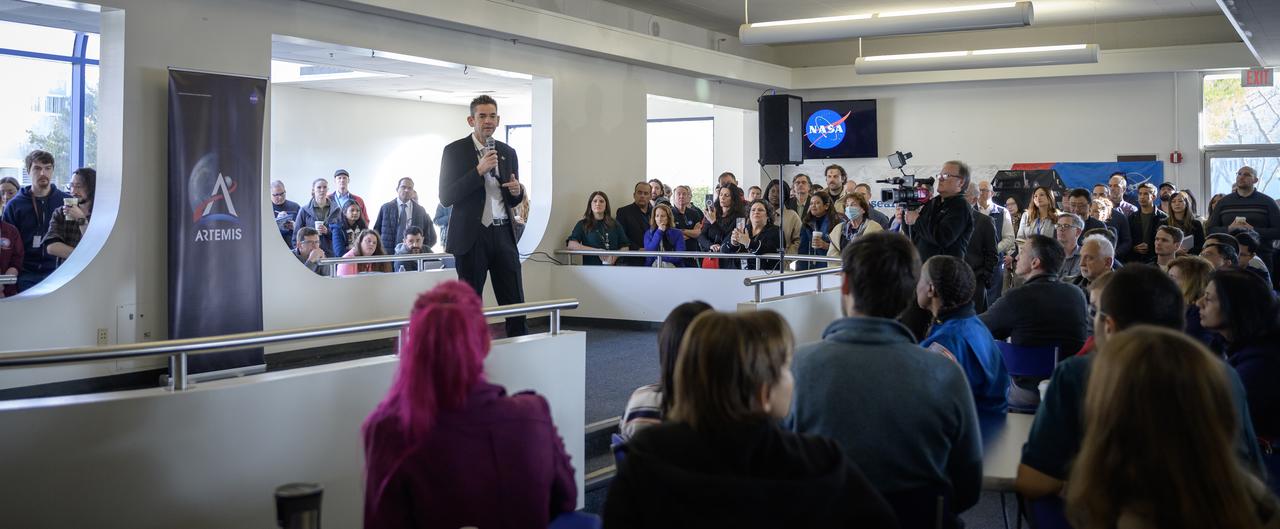 NASA Administrator Jared Isaacman speaks to Ames employees during his coffee and donuts event in MegaBites N235.