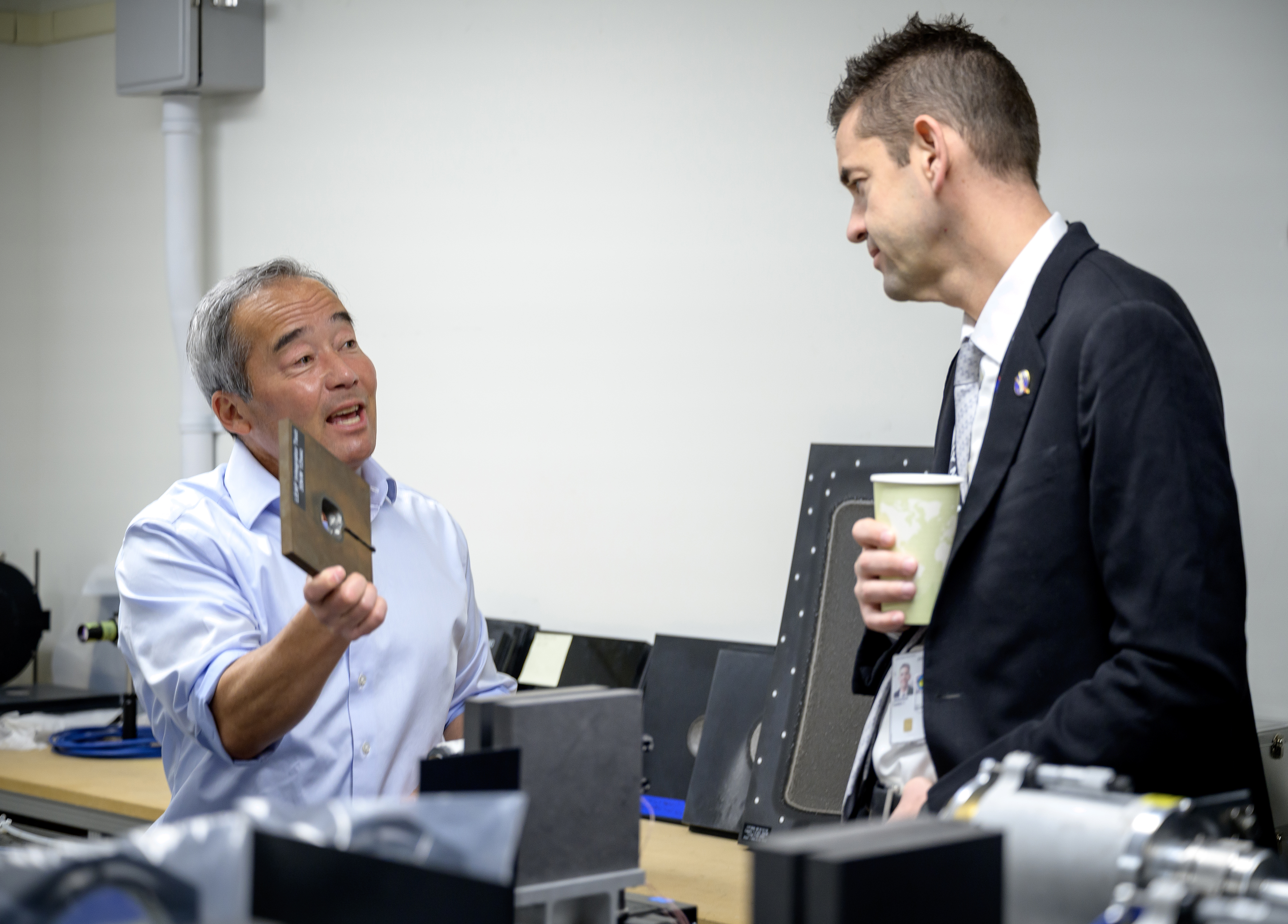 NASA Administrator Jared Isaacman speaks with Dr. George Raiche, Associate Director for Exploration Technology Infrastructure during his visit to the Arc Jet facility in N238.