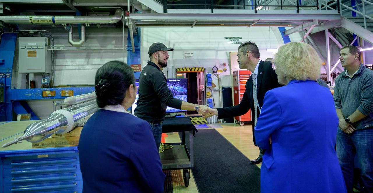 NASA Administrator Jared Isaacman meets wind tunnel staff during a tour of the Unitary Plan Wind Tunnel (UPWT) facility in N227.