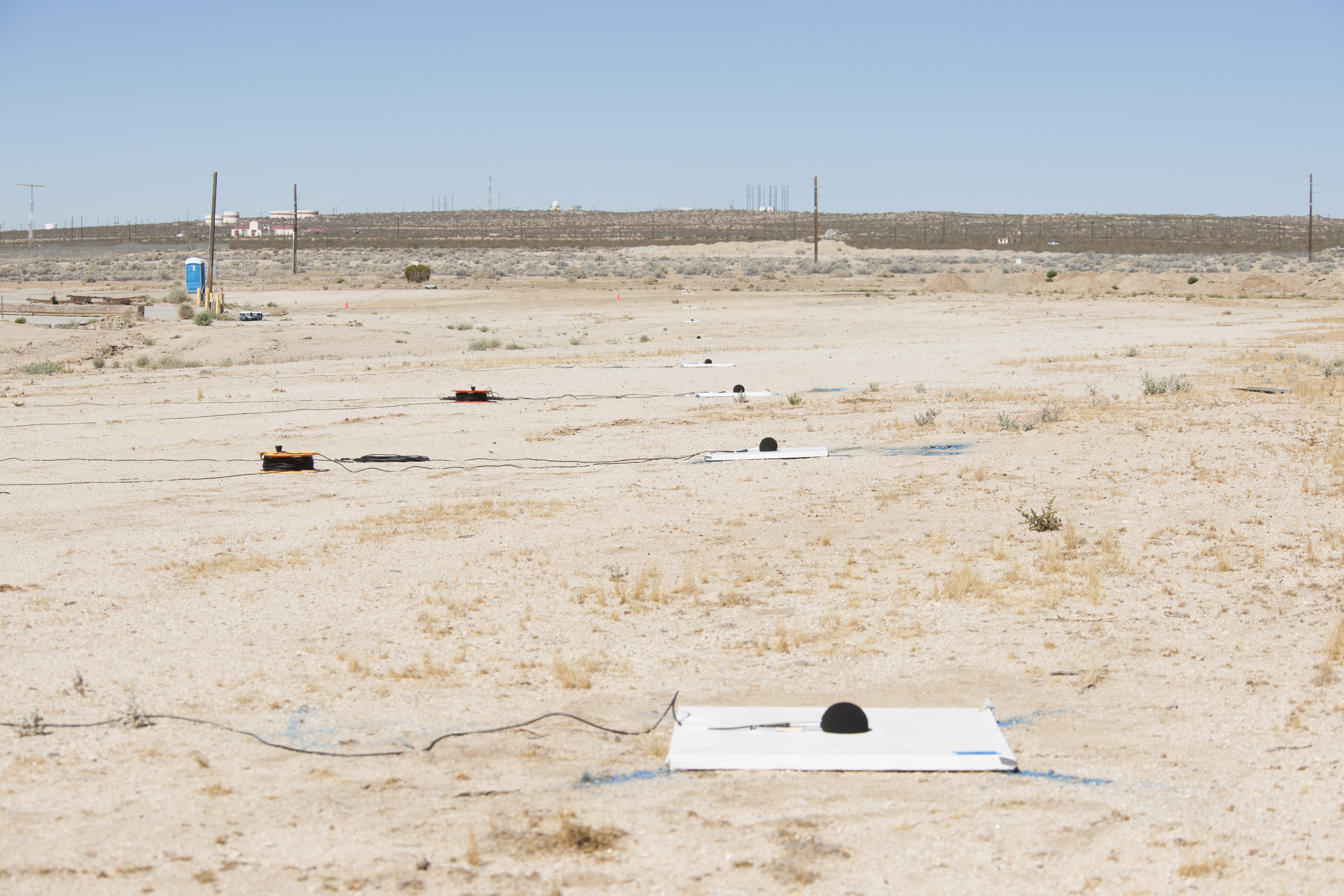 One of three microphone arrays positioned strategically along the ground at Edwards Air Force Base, California, sits ready to collect sound signatures from sonic booms created by a NASA F/A-18 during the SonicBAT flight series. The arrays collected the sound signatures of booms that had traveled through atmospheric turbulence before reaching the ground.