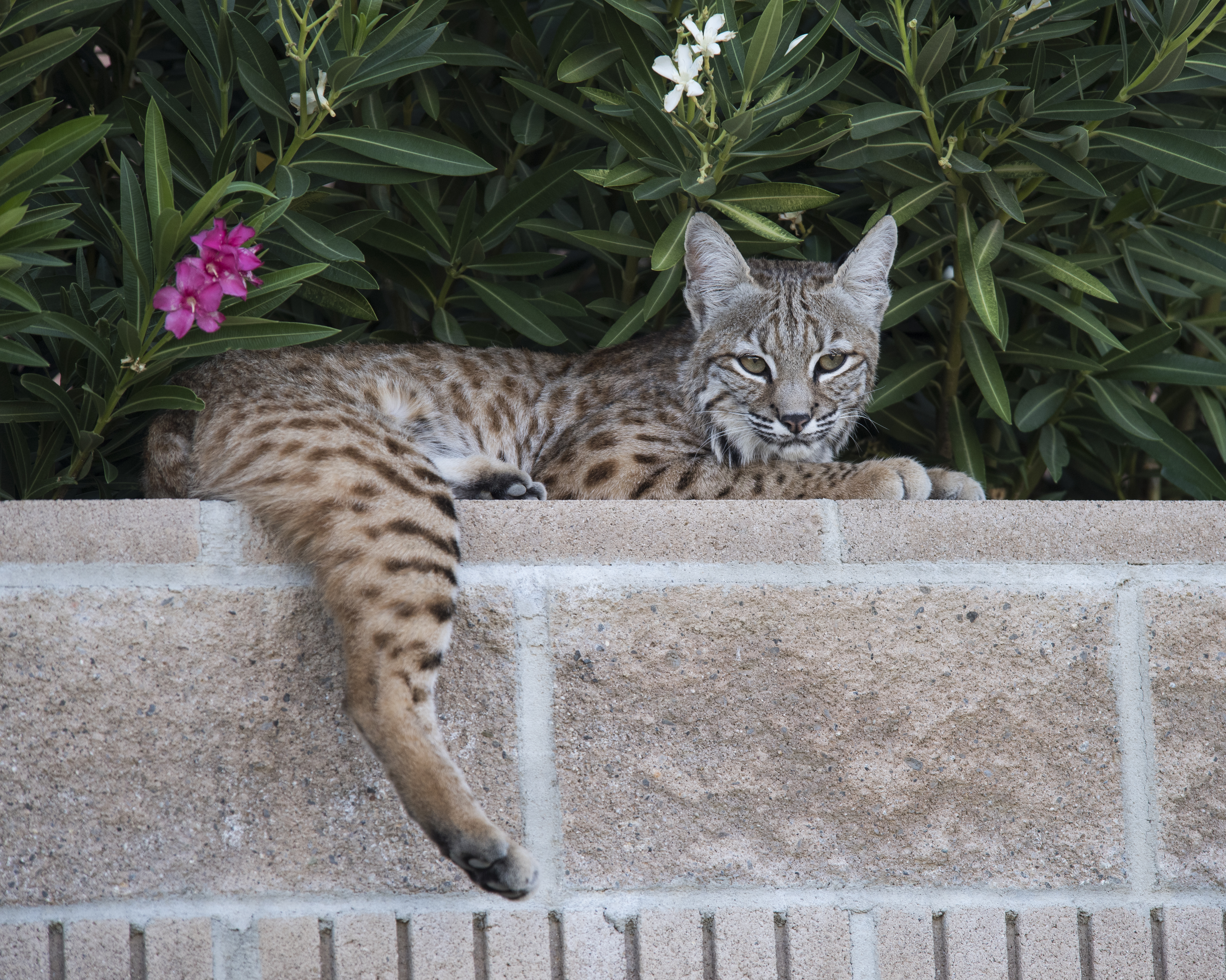 A bobcat resting leisurely on a retaining wall among the flowering bushes at Armstrong Flight Research Center in Edwards, California. The facility is home to a number of wild animals including the bobcats which are free to roam the more than 300,000 acres of Mojave Desert.