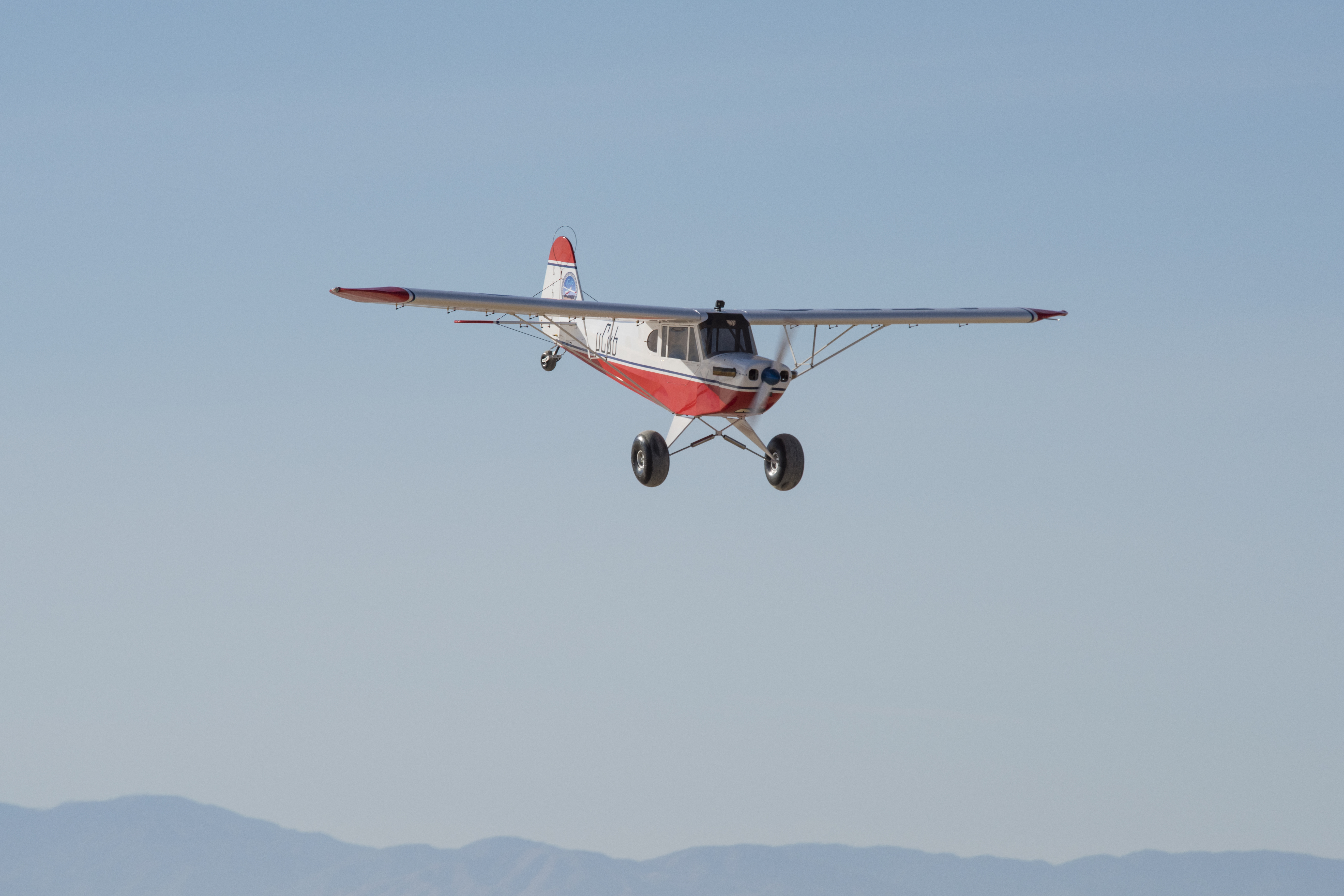 The MicroCub, a modified a Bill Hempel 60-percent-scale super cub, approaches for a landing at NASA's Armstrong Flight Research Center. This was the first flight of the MicroCub in which the crew validated the airworthiness of the aircraft.