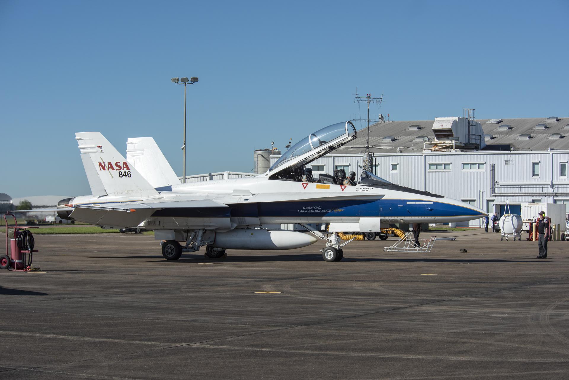 NASA test pilots Jim “Clue” Less and Wayne “Ringo” Ringelberg step to the F/A-18 research aircraft at Ellington Field and conduct pre-flight safety checks on the aircraft prior to a supersonic research flight for the QSF18 series.