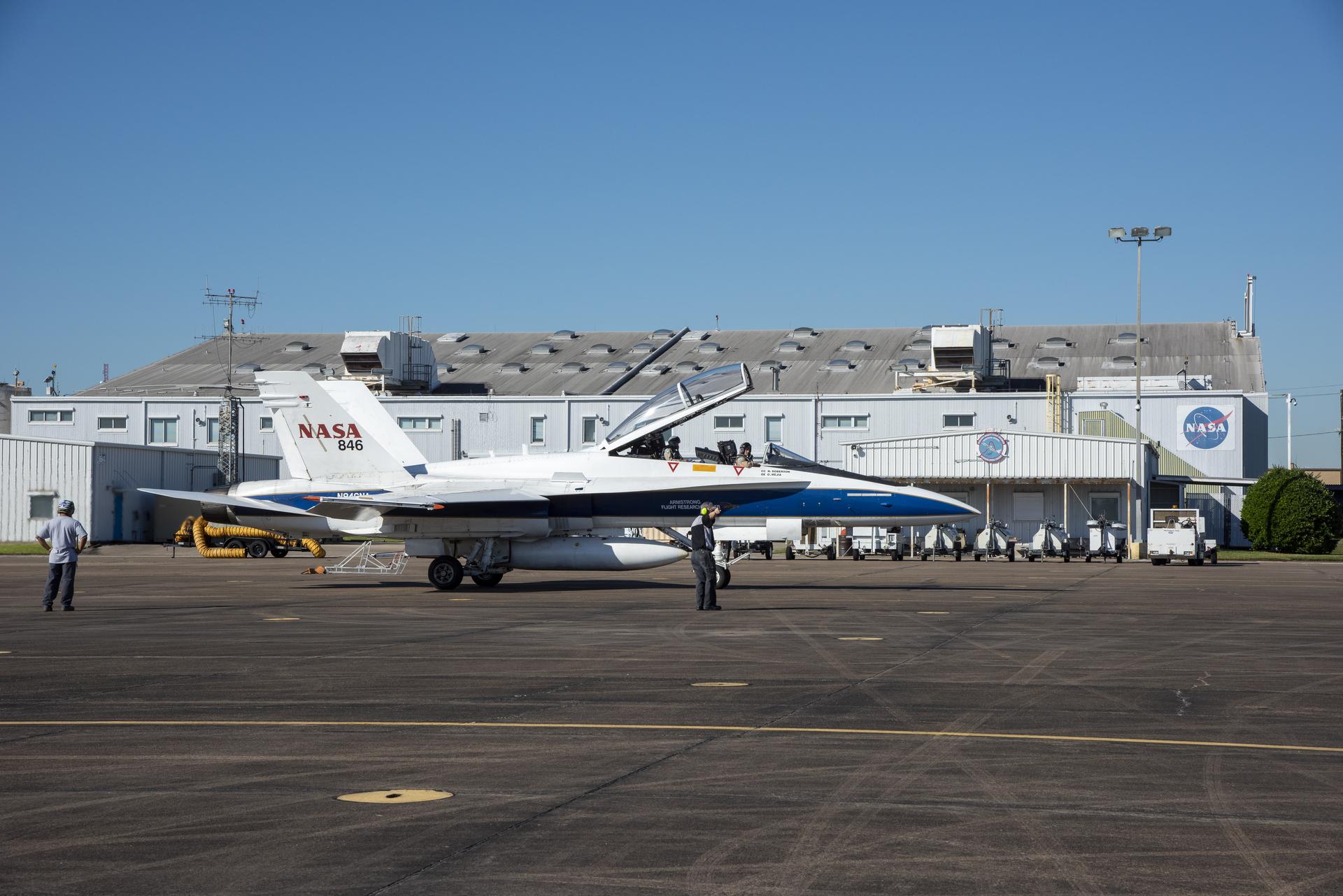NASA test pilots Jim “Clue” Less and Wayne “Ringo” Ringelberg step to the F/A-18 research aircraft at Ellington Field and conduct pre-flight safety checks on the aircraft prior to a supersonic research flight for the QSF18 series.