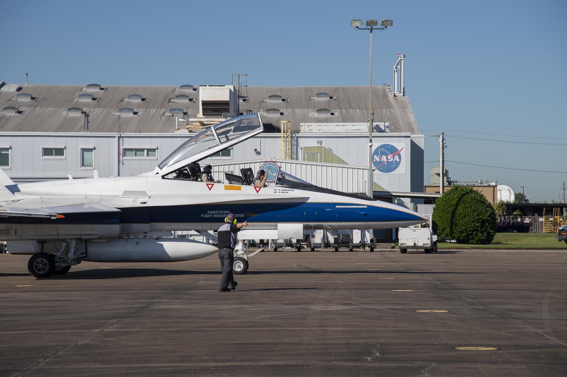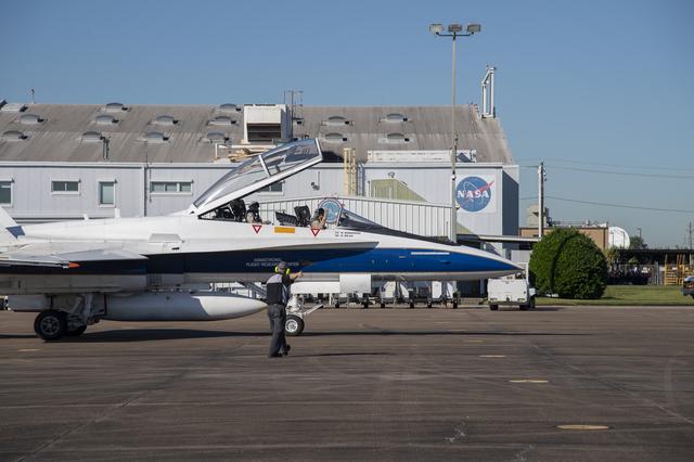 NASA test pilots Jim "Clue" Less and Wayne "Ringo" Ringelberg step to the F/A-18 research aircraft at Ellington Field and conduct pre-flight safety checks on the aircraft prior to a supersonic research flight for the QSF18 series.