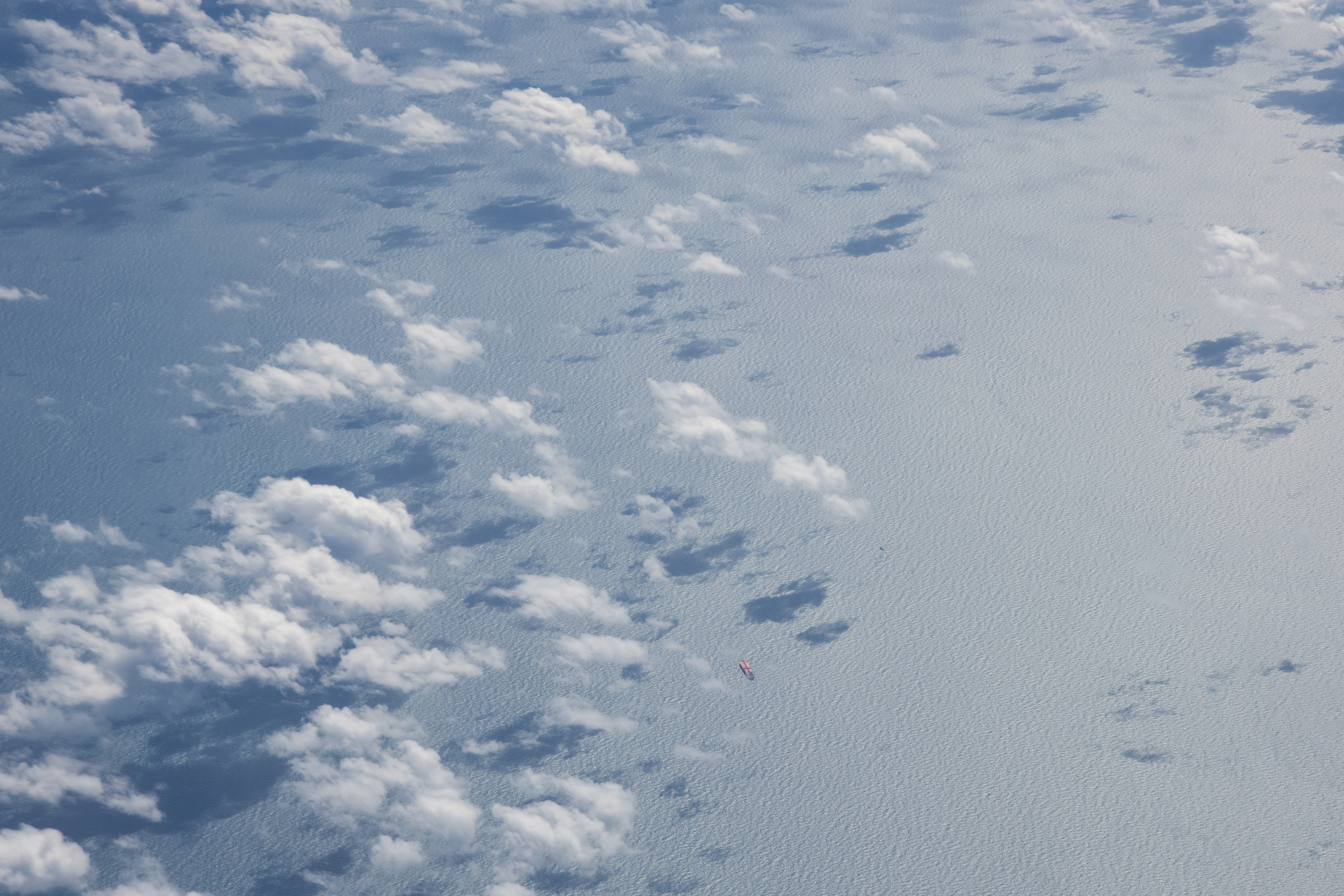 The Gulf of Mexico as seen from NASA photographer Carla Thomas at high altitude in the F/A-18 research aircraft during a flight in support of the Quiet Supersonic Flights 2018 series, or QSF18. The high altitude is necessary as part of the quiet supersonic dive maneuver, climbing to around 50,000 feet, followed by a supersonic, inverted dive. This creates sonic boom shockwaves in a way that they are quieter in a specific area.