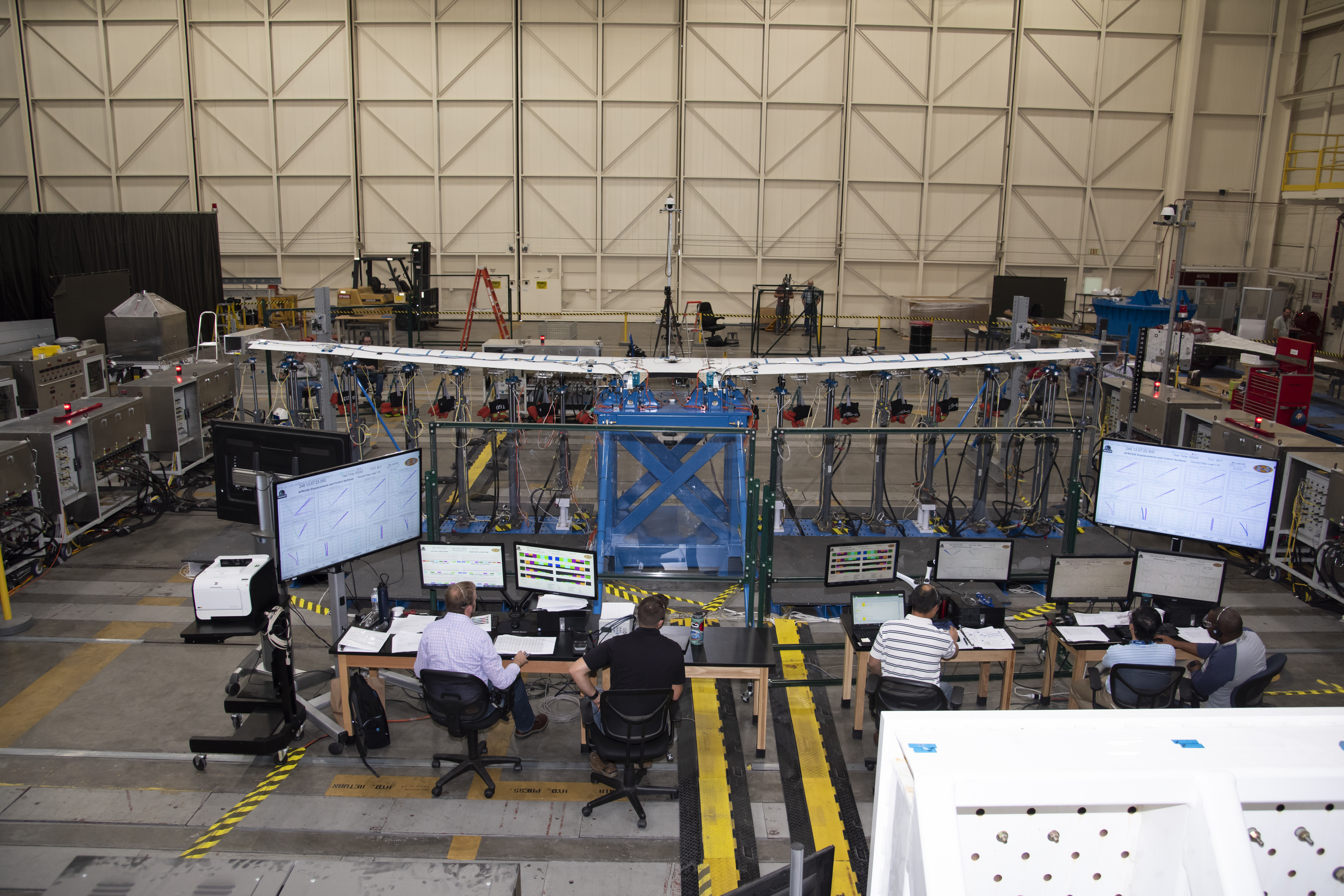 The X-57 distributed electric aircraft wing that will fly in the final configuration of the flight tests completed its testing at NASA's Armstrong Flight Research Center in California. The test above researched the wing's structure under stress of 120% of the design limit. Tests increased confidence in the wing's durability and calibrated installed strain gauges for inflight load monitoring of the wing. From left to right are Eric Miller, Tony Cash, Welsey Li, Shun-fat Lung and Ashante Jordan.