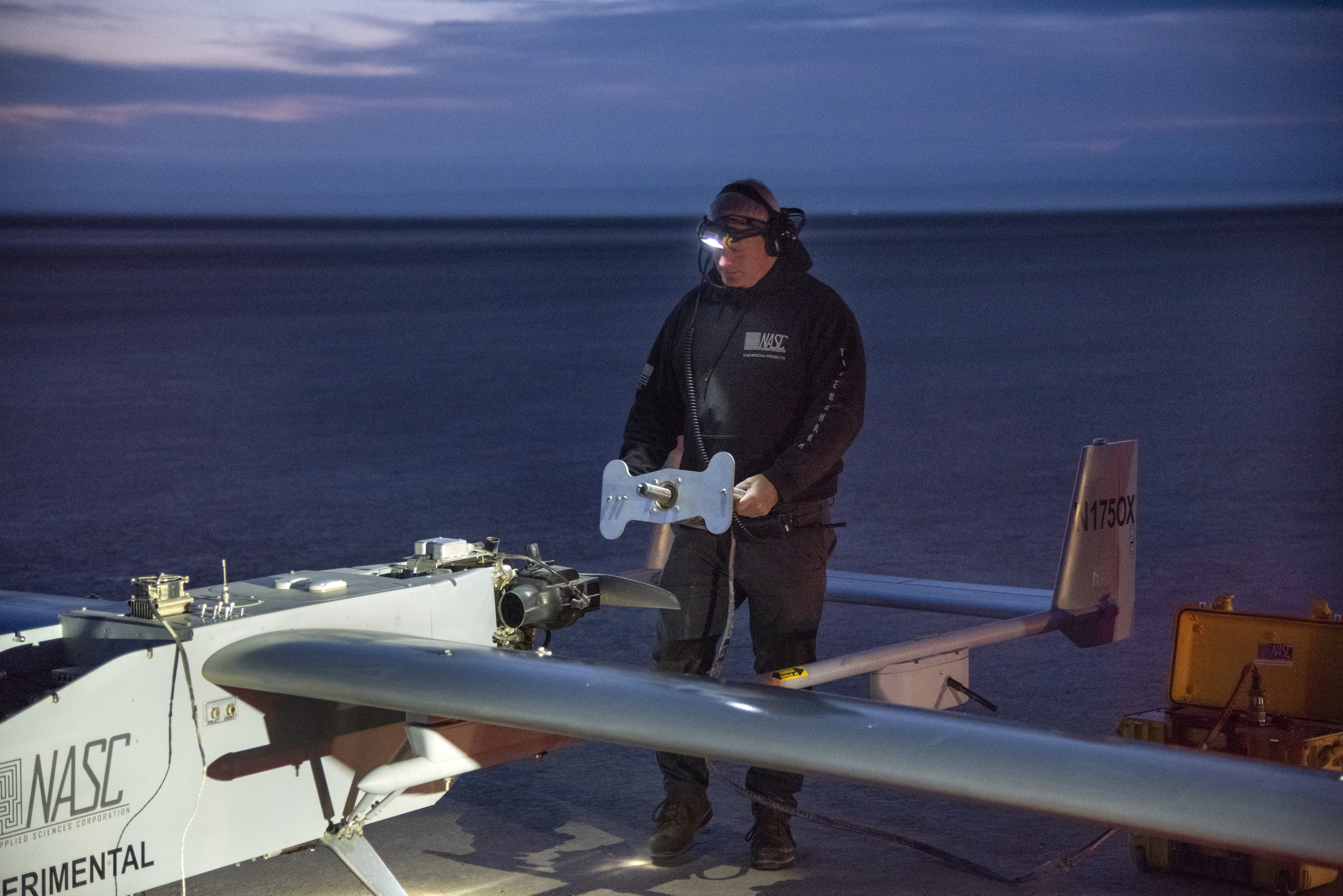 The Navmar Applied Sciences Corporation’s TigerShark prepares for its final takeoff at Edwards Air Force Base for the Unmanned Aircraft Systems integration in the National Airspace Systems, Flight Test Series Six (FT6) project. FT6 flight tests took place at NASA’s Armstrong Flight Research Center in California and focused on low size weight and power sensors for Detect and Avoid (DAA) operations in controlled airspace to inform the FAA through the RTCA Special Committee DAA Working Group on the phase 2 minimum operational performance standards for DAA and air-to-air radar.