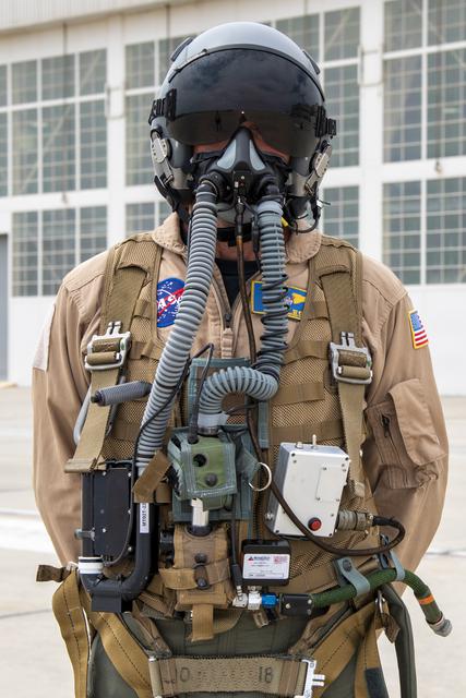 NASA research pilot Jim Less wears a U.S. Navy harness configuration with the NASA Jet Propulsion Laboratory in California prototype mask, which uses laser sensors to determine levels of carbon dioxide and water exhaled inside the mask. This prototype was tested in conjunction with the current VigilOX system, which measures the pilot’s oxygen concentration, breathing pressures and flow rates. This and the U.S. Air Force configuration was used in the Pilot Breathing Assessment program at NASA’s Armstrong Flight Research Center in California.