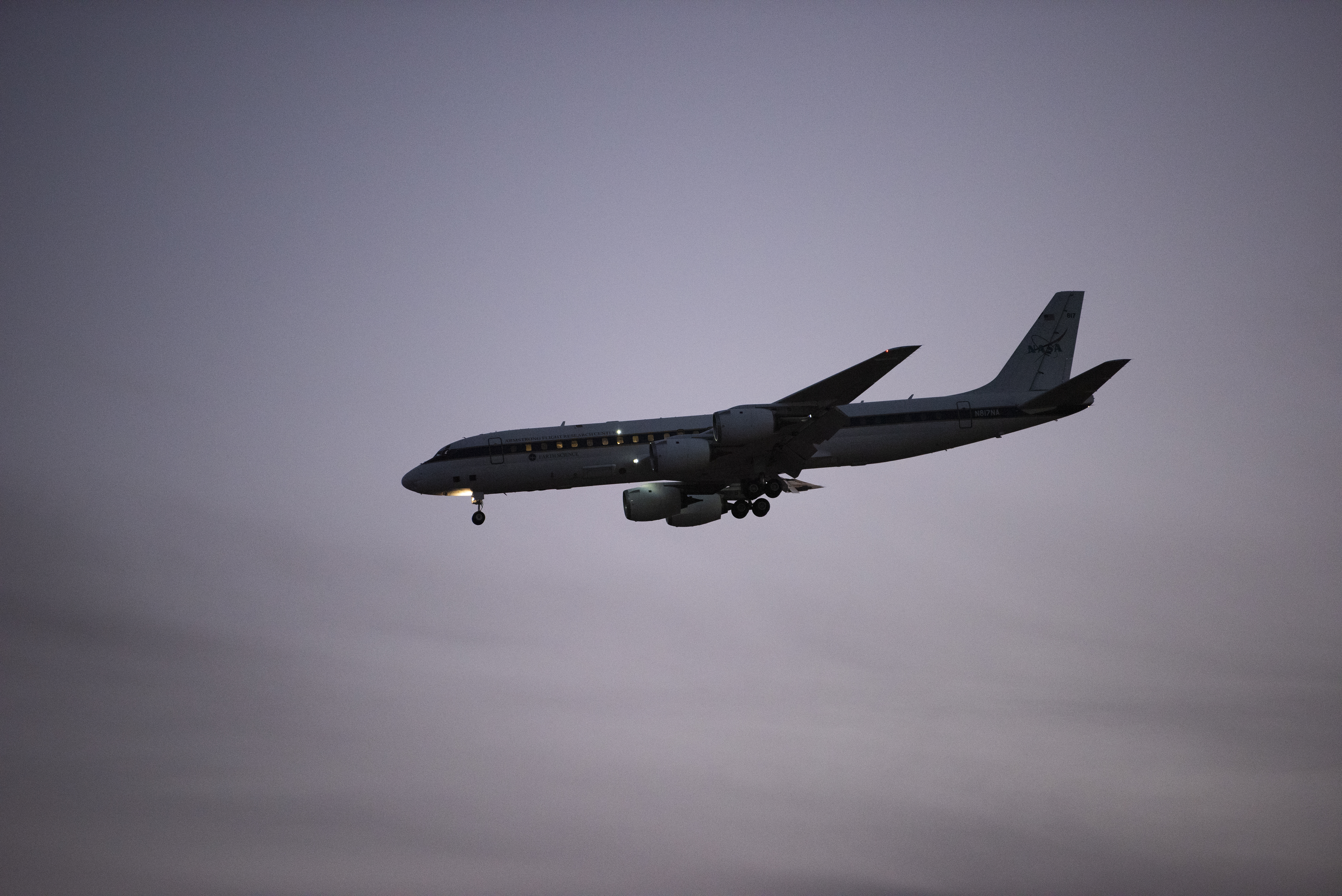 DC-8 lifts off from Air Force Plant 42 in Palmdale, Calif., at sunset.