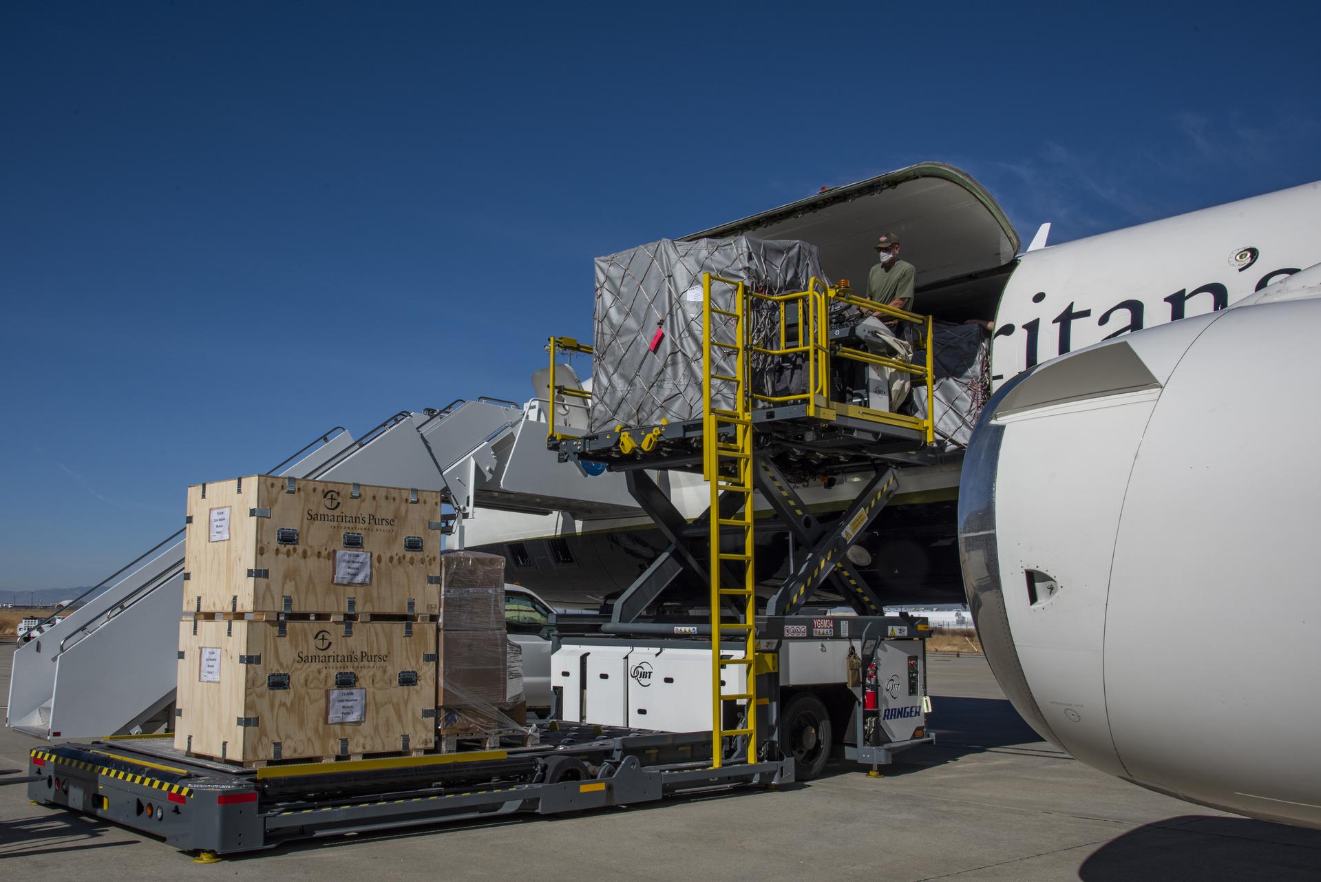 Samaritan Purse landed its DC-8 at NASA's Armstrong Flight Research Center Building 703 in Palmdale, California, to deliver supplies needed to meet the demands of the COVID-19 pandemic. NASA Armstrong personnel assisted in unloading the aircraft.