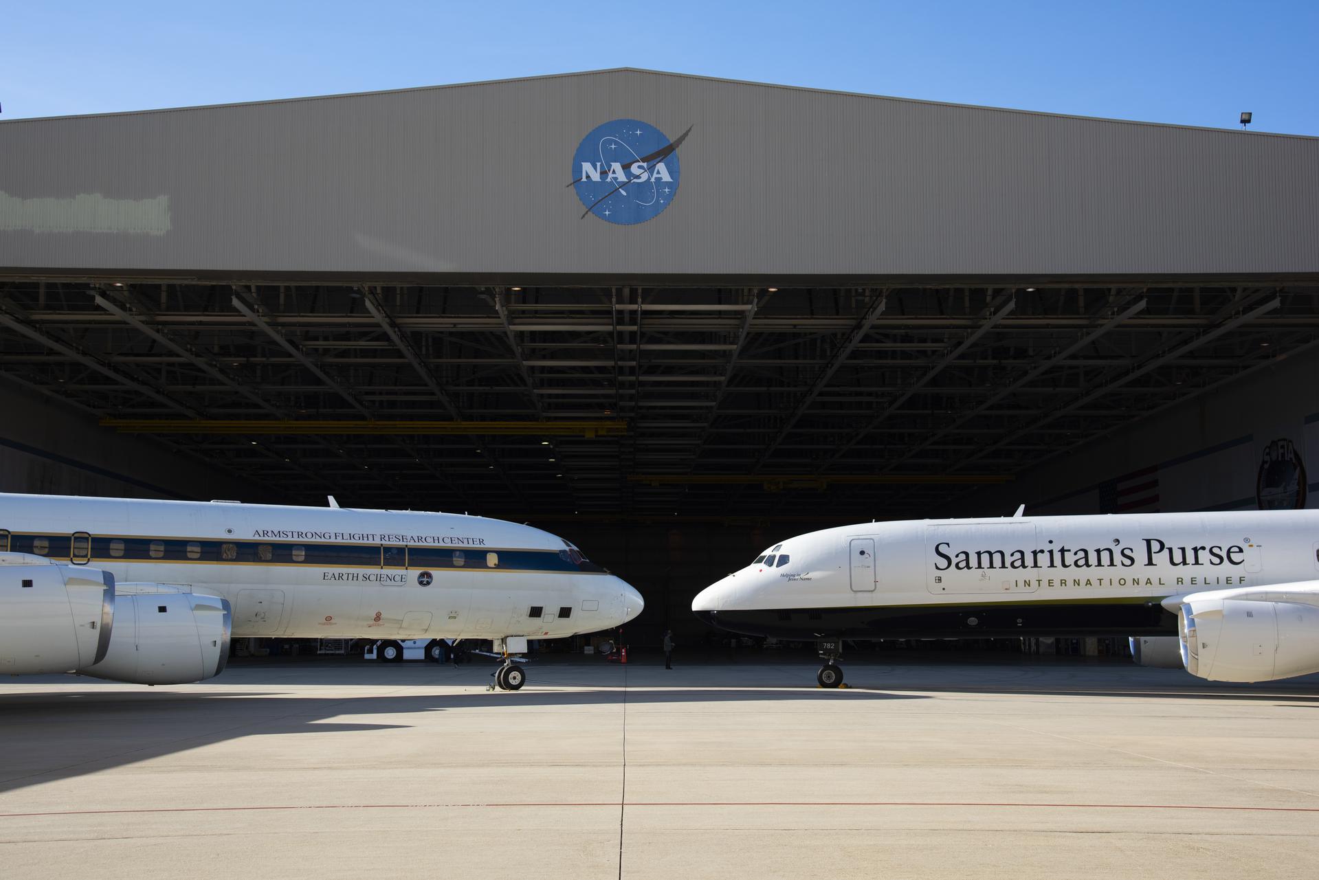NASA and Samaritan's Purse DC-8 aircrafts met on the ramp in front of NASA's Armstrong Flight Research Center Building 703.