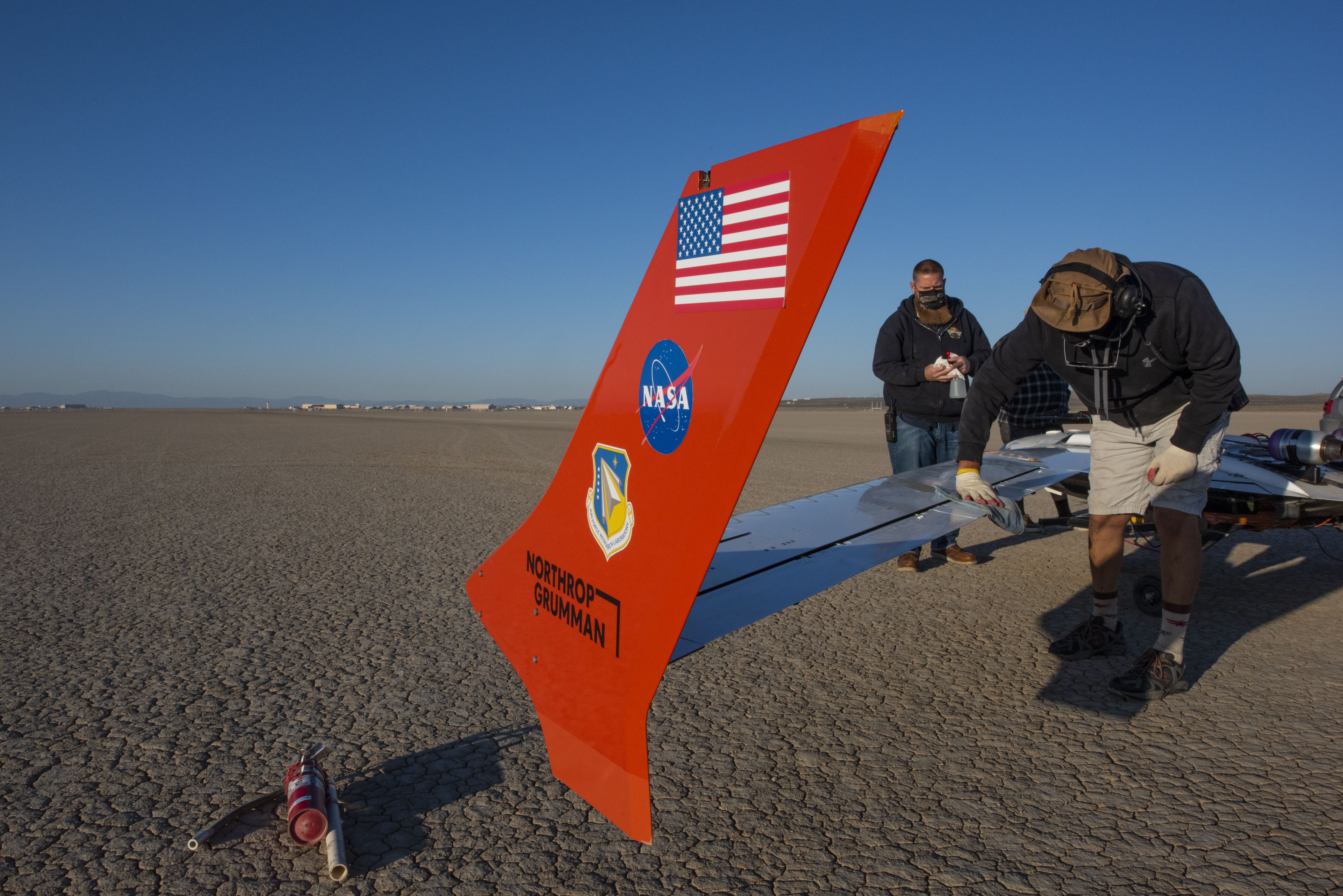 The X-56B remotely piloted aircraft ground crew prepares the aircraft to begin a new flight series. The flight was April 19 at NASA's Armstrong Flight Research Center in Edwards, California, with partner Northrop Grumman.