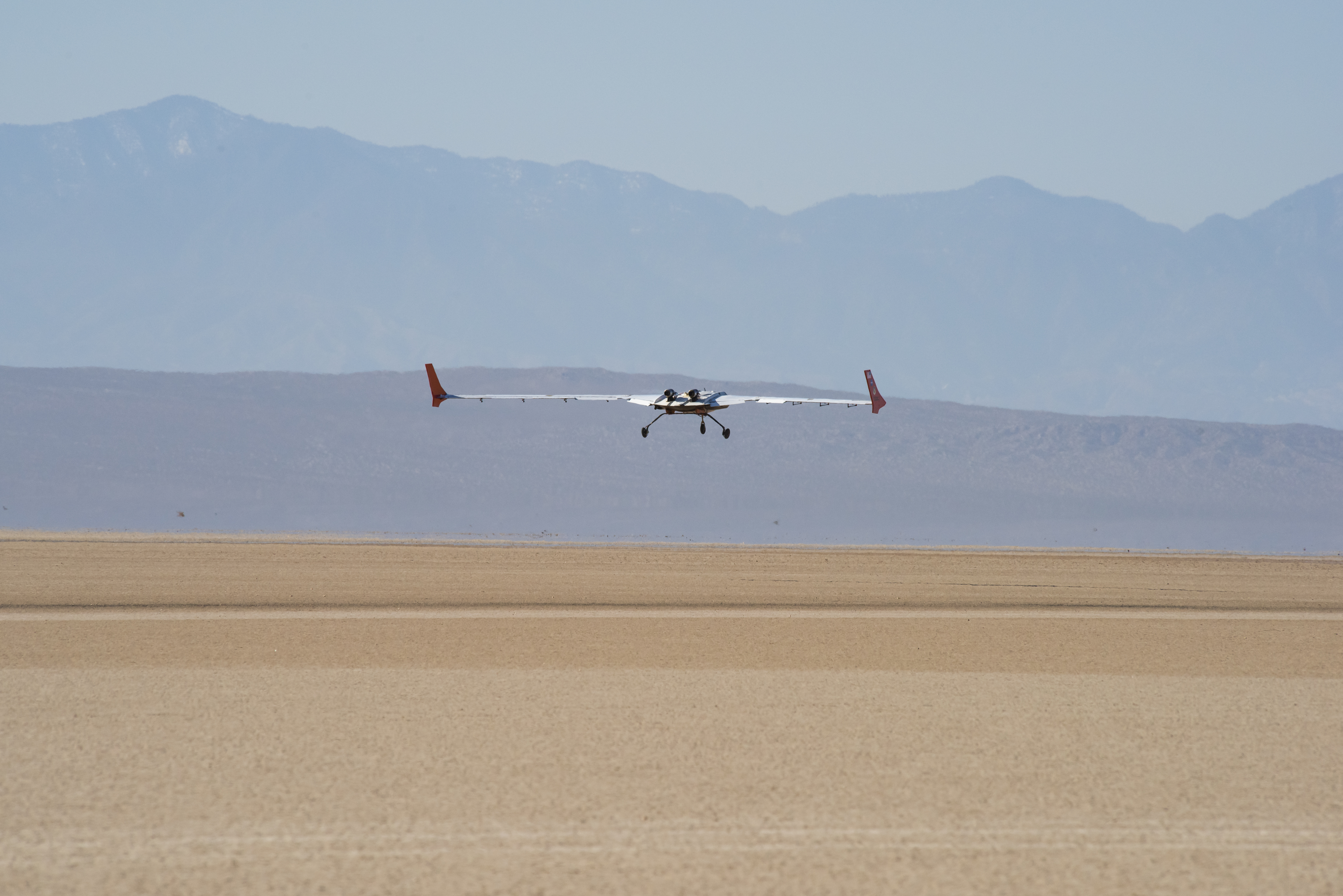 The X-56B remotely piloted aircraft prepares for a landing following the first of a new flight series. The flight was April 19 at NASA's Armstrong Flight Research Center in Edwards, California, with partner Northrop Grumman.