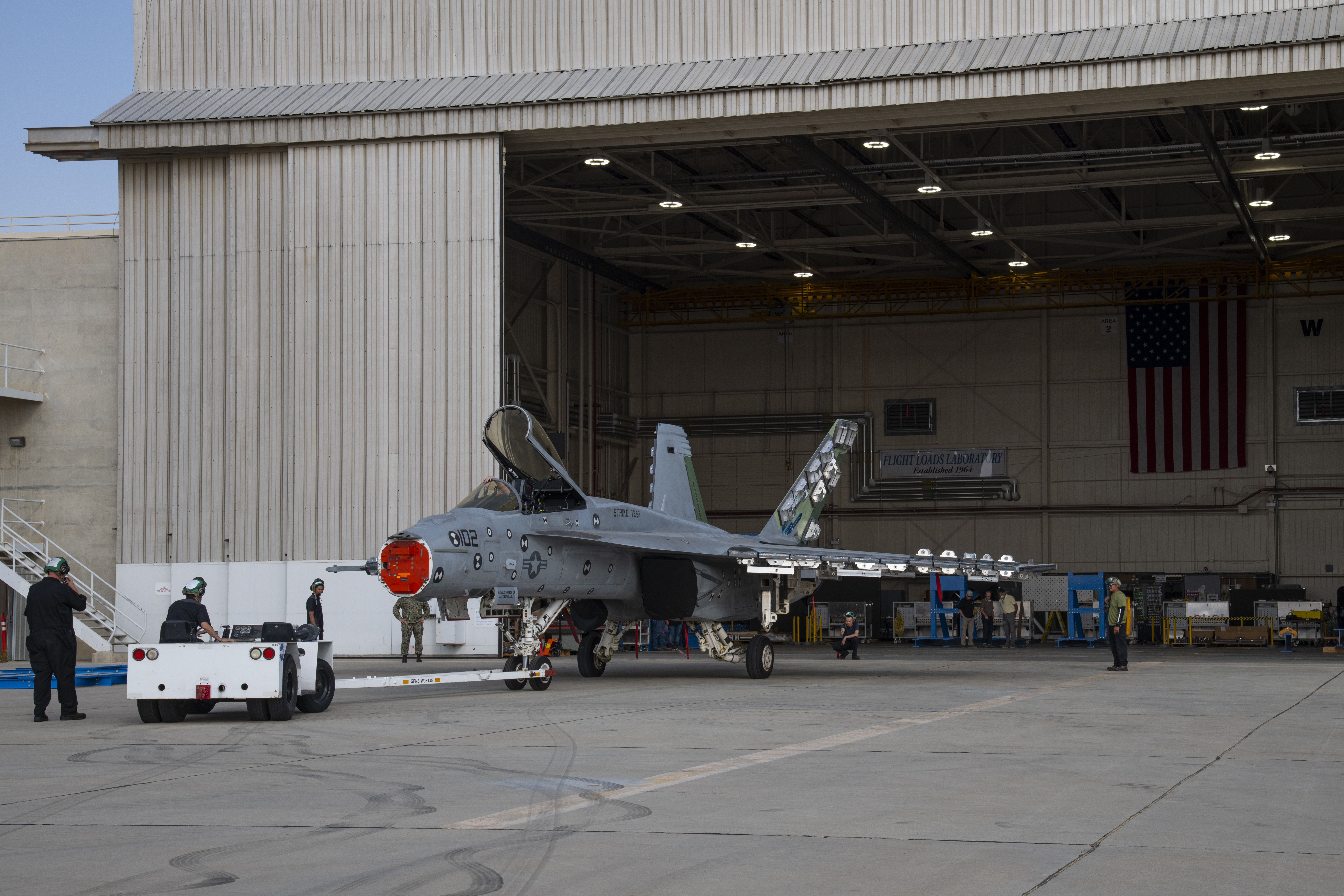 The Naval Air Systems Command (NAVAIR) in Patuxent River, Maryland F/A-18E is moved to NASA’s Armstrong Flight Research Center Flight Loads Laboratory in Edwards, California. NASA Armstrong is working on its biggest load calibrations tests on an F/A-18E Super Hornet. This testing is needed before the aircraft can serve as a test vehicle for determining if it can safely manage maneuvers and proposed upgrades.
