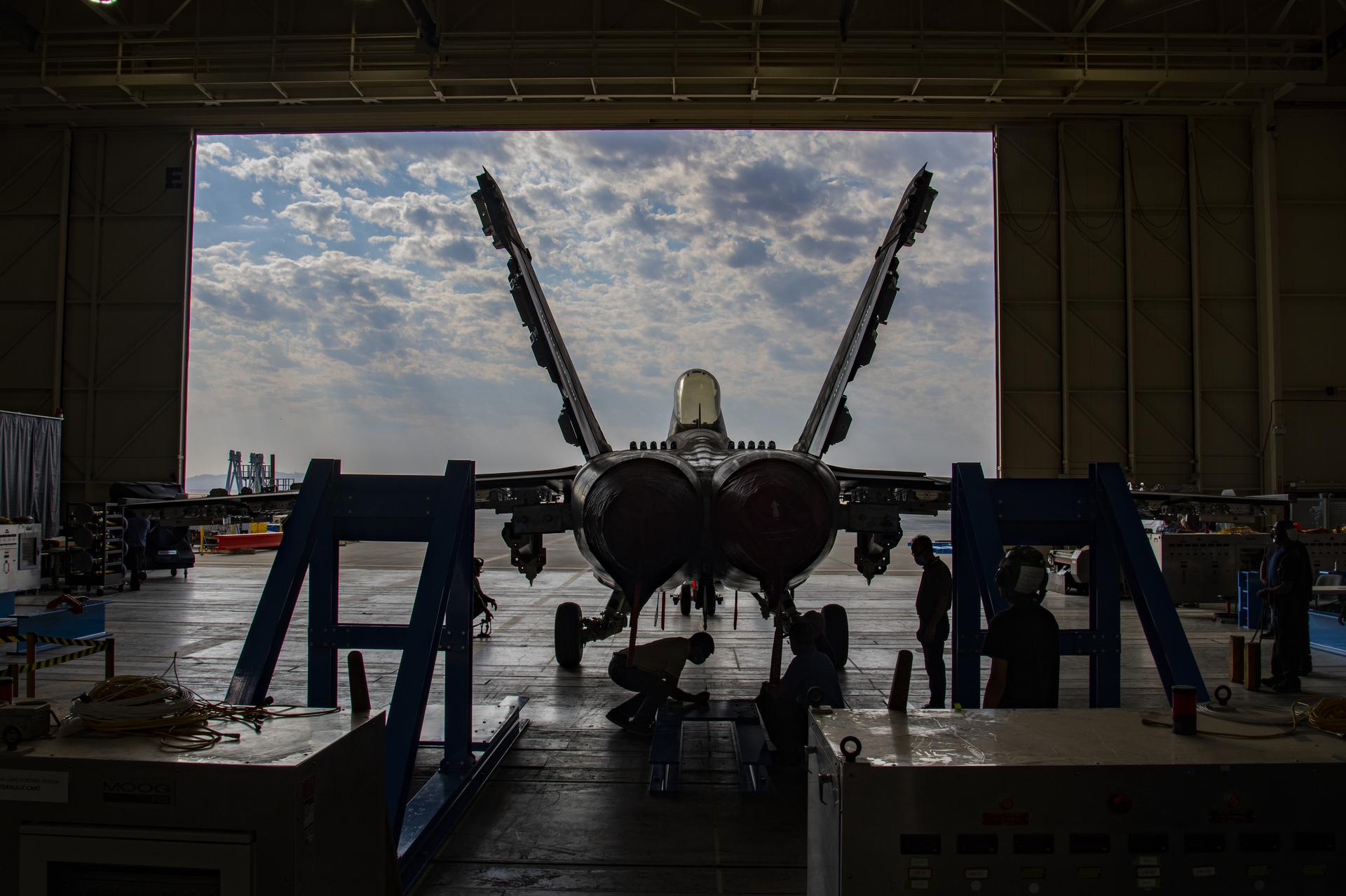 The Naval Air Systems Command (NAVAIR) in Patuxent River, Maryland F/A-18E is moved to NASA’s Armstrong Flight Research Center Flight Loads Laboratory in Edwards, California. NASA Armstrong is working on its biggest load calibrations tests on an F/A-18E Super Hornet. This testing is needed before the aircraft can serve as a test vehicle for determining if it can safely manage maneuvers and proposed upgrades.