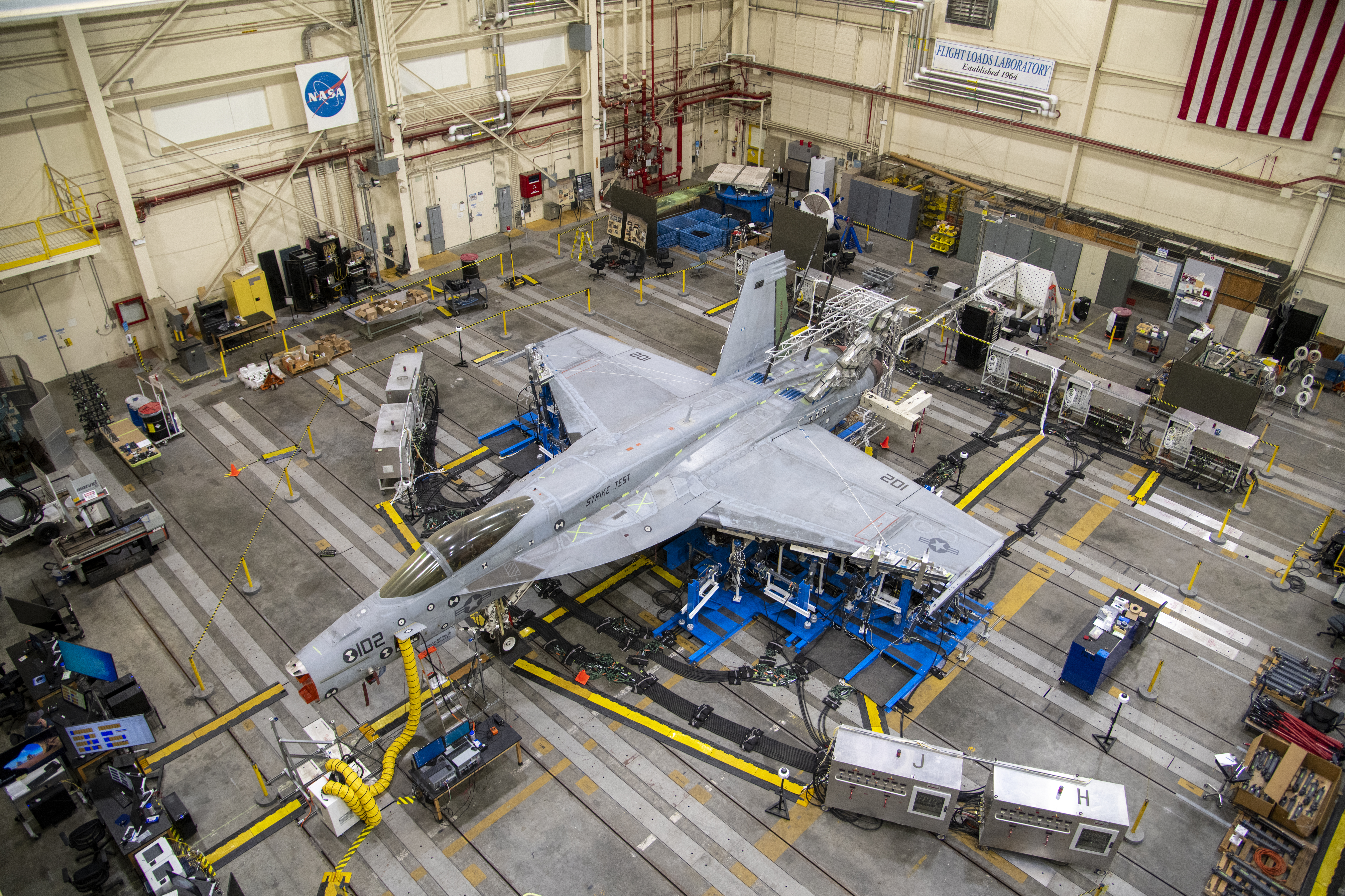 NASA’s Armstrong Flight Research Center Flight Loads Laboratory in Edwards, California, is working on one of its biggest load calibrations tests on an F/A-18E Super Hornet from the Naval Air Systems Command (NAVAIR) in Patuxent River, Maryland. This testing is needed before the aircraft can serve as a test vehicle for determining if it can safely manage maneuvers and proposed upgrades. This is a view of the test setup for the wing loads testing that is set to begin in December 2021.
