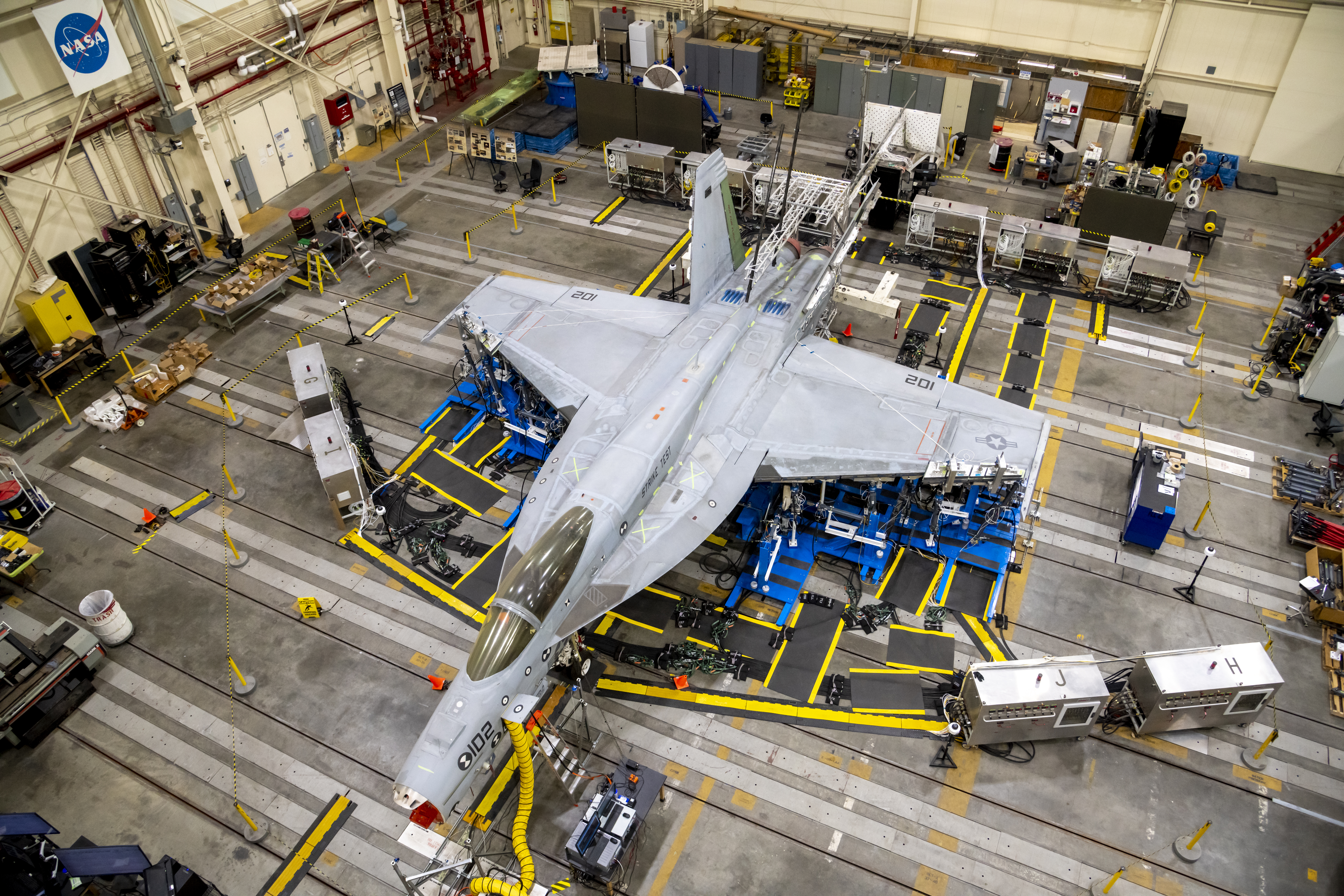 A top view shows the wing loading test configuration of a F/A-18E from the Naval Air Systems Command (NAVAIR) in Patuxent River, Maryland. The aircraft is in NASA’s Armstrong Flight Research Center Flight Loads Laboratory in Edwards, California, for the center’s biggest load calibrations tests. This testing is needed before the aircraft can serve as a test vehicle for determining if it can safely manage maneuvers and proposed upgrades.