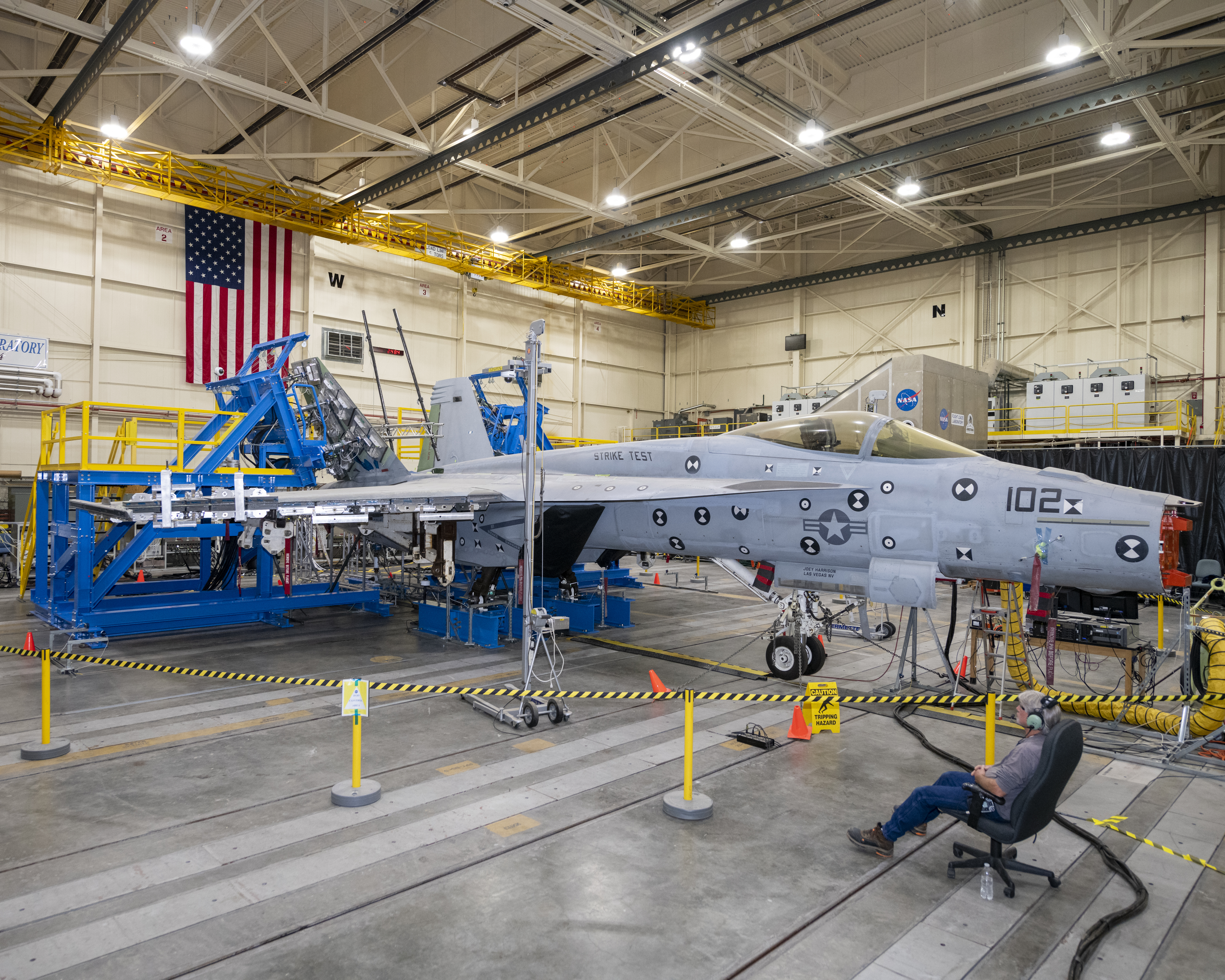 Here is another view of the vertical tail loads testing on a Navy F/A-18E that concluded in May, wrapping up the third phase of research at NASA’s Armstrong Flight Research Center in Edwards, California. The first two phases included loads calibration testing focused on the aircraft’s horizontal tails and wings. The aircraft is from the Naval Air Systems Command (NAVAIR) in Patuxent River, Maryland. NAVAIR retired its previous loads test aircraft and NASA Armstrong staff are assisting to prepare the new aircraft for its role to help safely manage flight maneuvers and determine how the F/A-18E fleet will perform if proposed upgrades are incorporated.