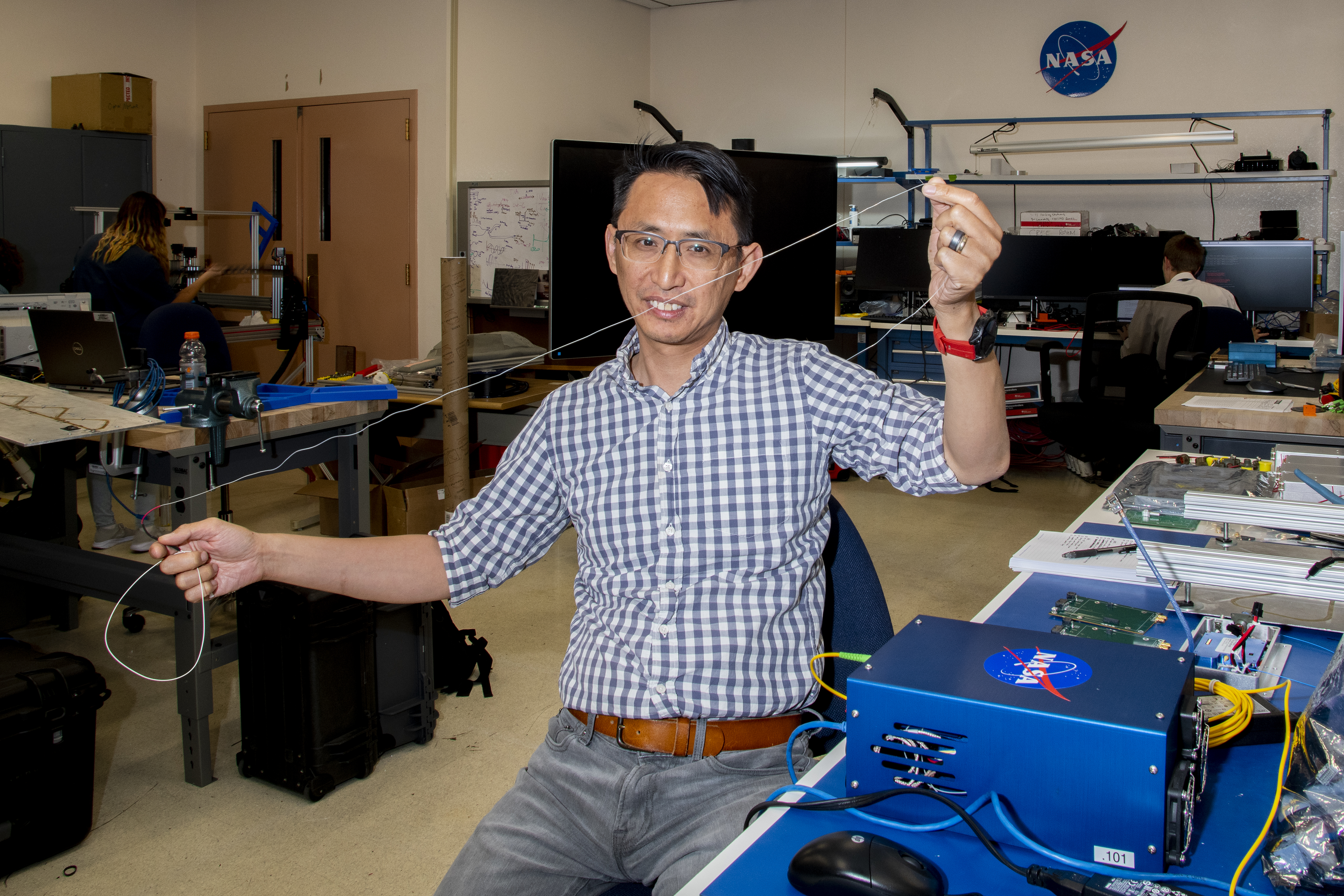 Patrick Chan, electronics engineer, and NASA Armstrong Flight Research Center’s FOSS portfolio project manager, shows a fiber used in a temperature sensing system. Armstrong’s Fiber Optic Sensing System was used to measure temperatures during tests aimed at turning oxygen into liquid oxygen. Testing was conducted at NASA’s Glenn Research Center in Cleveland, Ohio.