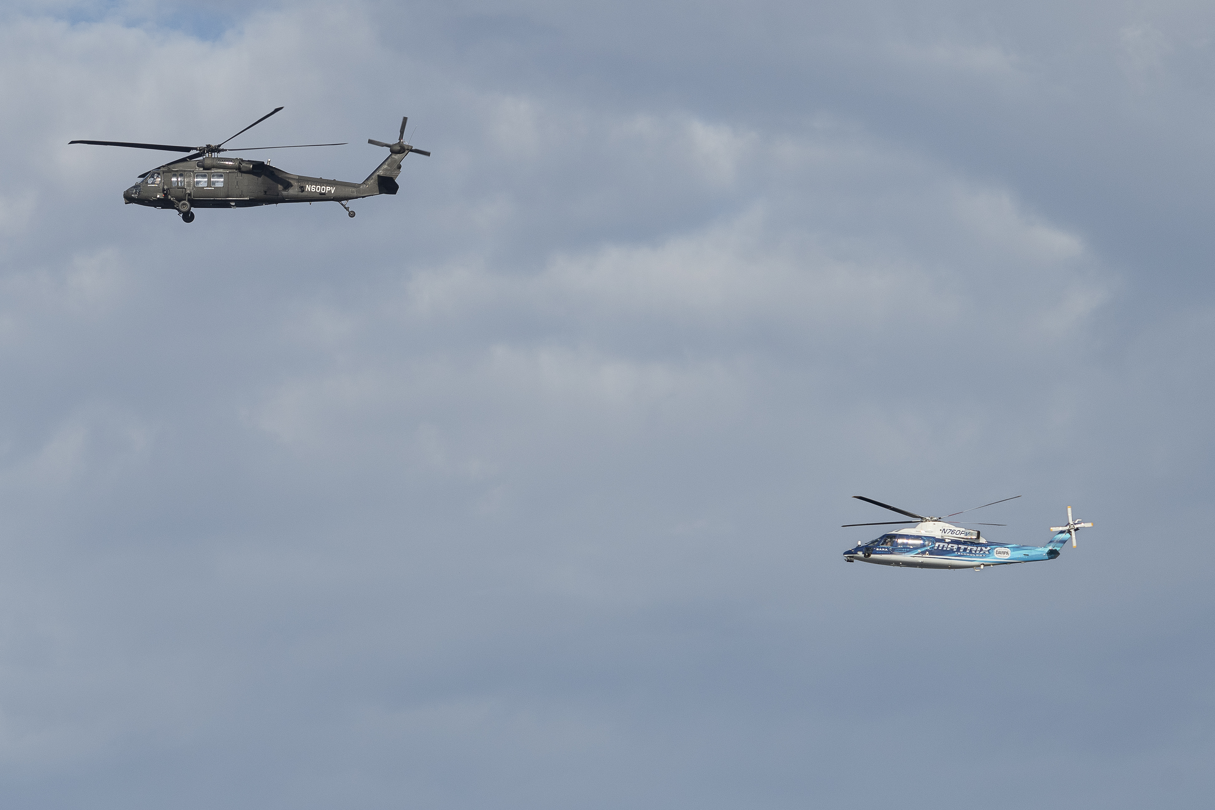 NASA pilots along with Sikorsky safety pilots flying Sikorsky’s Black Hawk Optionally Piloted Vehicle, left, and SARA S-76B over Long Island Sound Thursday, Oct. 26, 2023. These flights will allow NASA researchers to test and evaluate multiple Advanced Air Mobility autonomous flight software products designed by NASA.