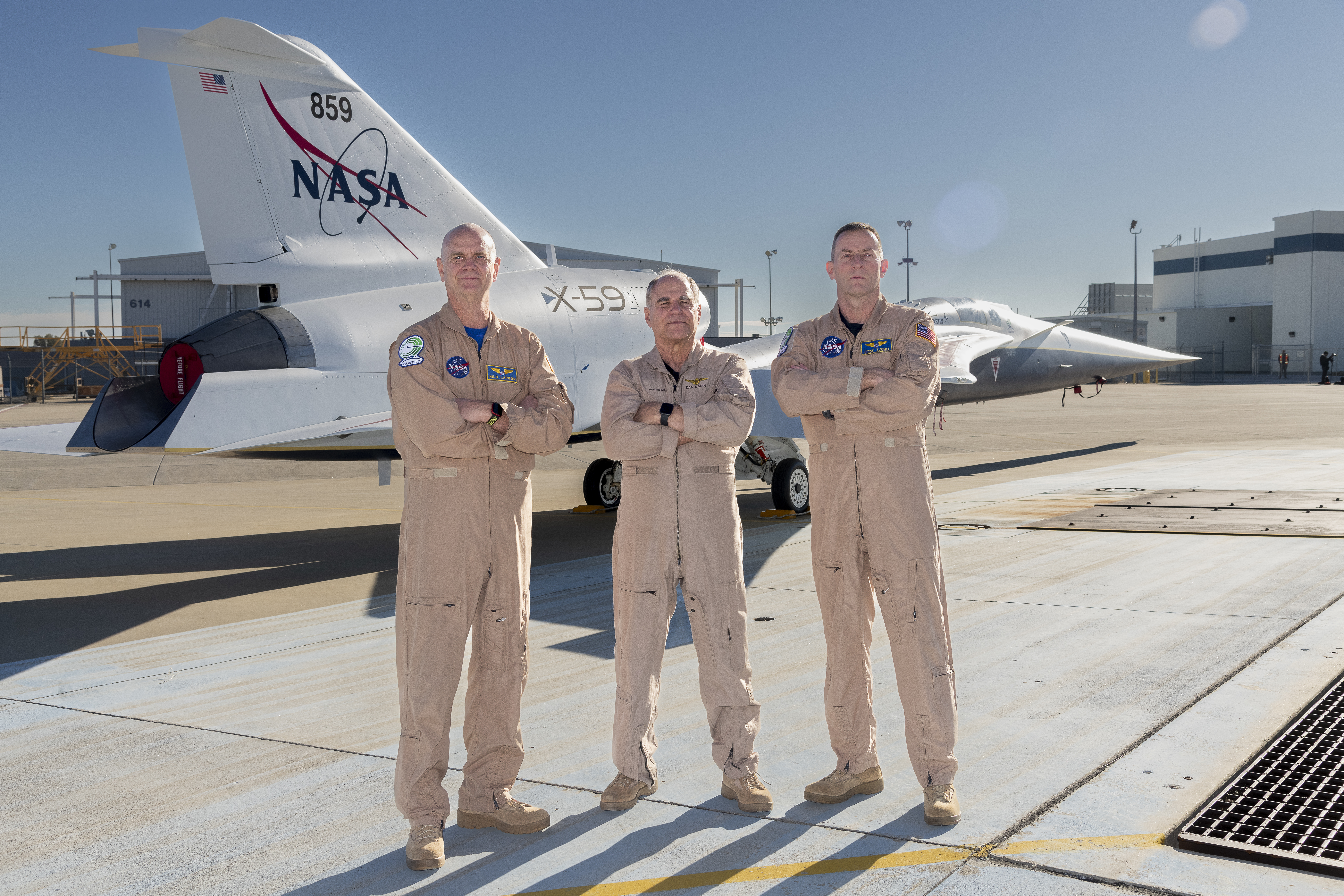 NASA test pilots Nils Larson (left) and Jim “Clue” Less (right), and Lockheed Martin test pilot Dan “Dog” Canin pose with the newly-painted X-59 as it sits on the ramp at Lockheed Martin Skunk Works in Palmdale, California. The X-59 is the centerpiece of NASA’s Quesst mission, which seeks to solve one of the major barriers to supersonic flight over land, currently banned in the United States, by making sonic booms quieter.
