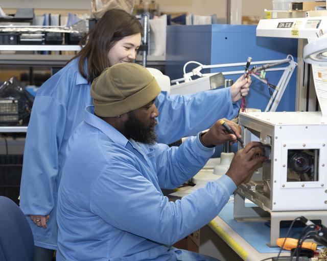 NASA researchers James Cowart and Elizabeth Nail add sensors, wiring and cameras, to the NASA Airborne Instrumentation for Real-world Video of Urban Environments (AIRVUE) sensor pod at NASA’s Armstrong Flight Research Center in Edwards, California in late February 2024. The AIRVUE pod was flown on a helicopter at NASA’s Kennedy Space Center in Florida and is used to collect data for future autonomous aircraft.