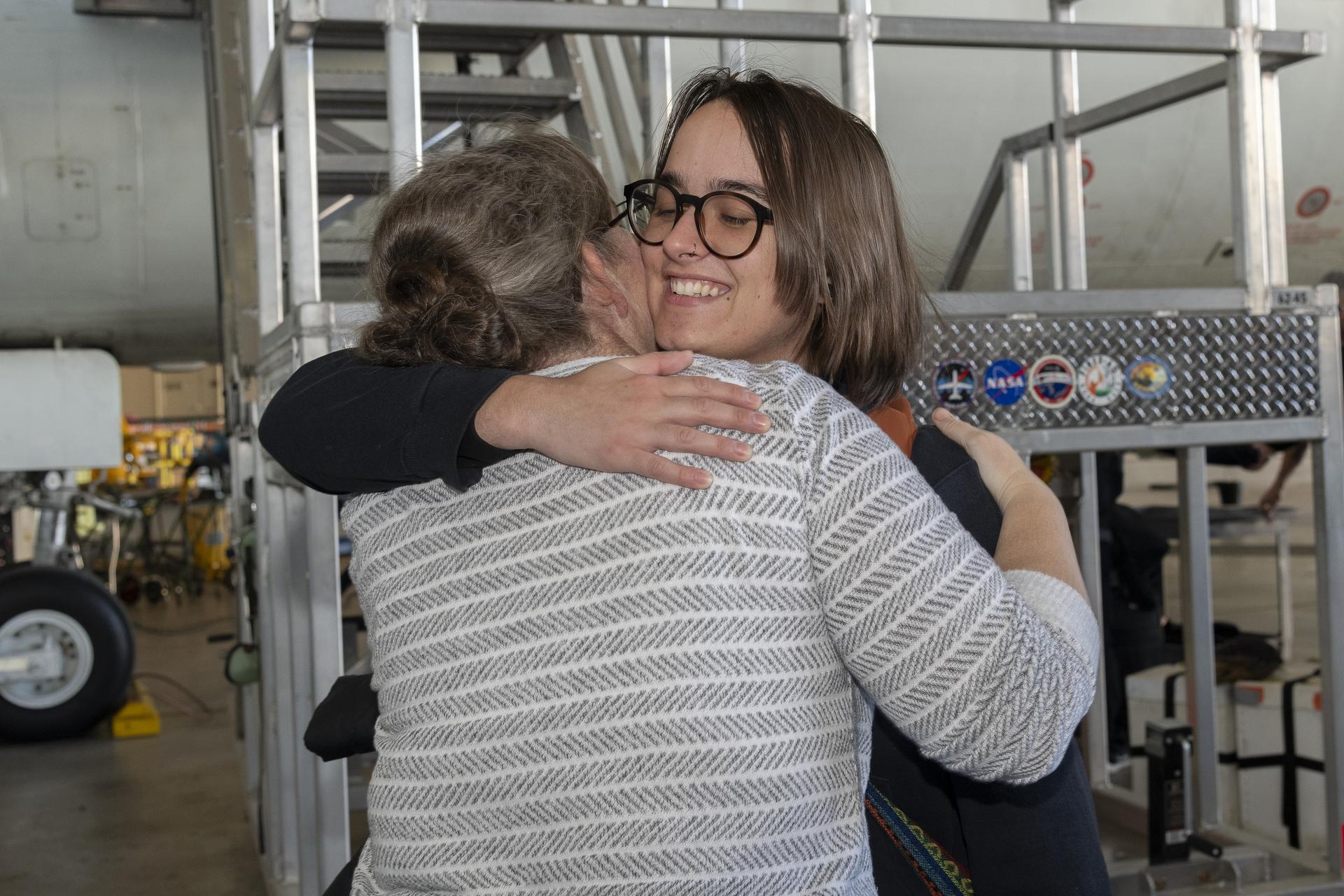 NASA’s DC-8 operations engineer, Nickelle “Nicki” Reid, left, embraces Katherine Ball, chemical engineering Ph.D. candidate at California Institute of Technology, after the DC-8 aircraft and crew return to NASA Armstrong’s Building 703 in Palmdale, California, on April 1, 2024, following the aircraft’s final mission in support of the Airborne and Satellite Investigation of Asian Air Quality (ASIA-AQ).