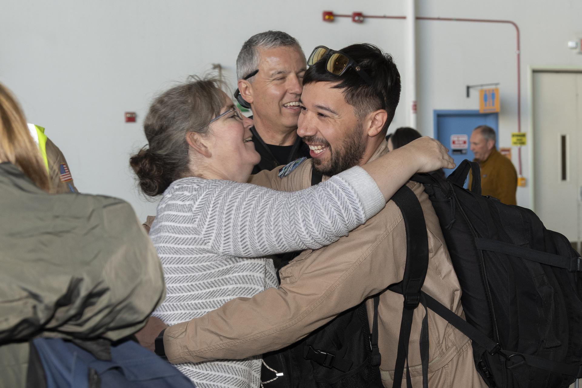 NASA DC-8 crew members Nickelle “Nicki” Reid, operations engineer, left, and Isac Mata, engineer technician, exchange in a heartfelt hug after the DC-8 aircraft and crew return to NASA Armstrong’s Building 703 in Palmdale, California, on April 1, 2024, following the aircraft’s final mission in support of the Airborne and Satellite Investigation of Asian Air Quality (ASIA-AQ). Smiling in the background is Michael Thomson, director of NASA Armstrong’s Science Mission Directorate.