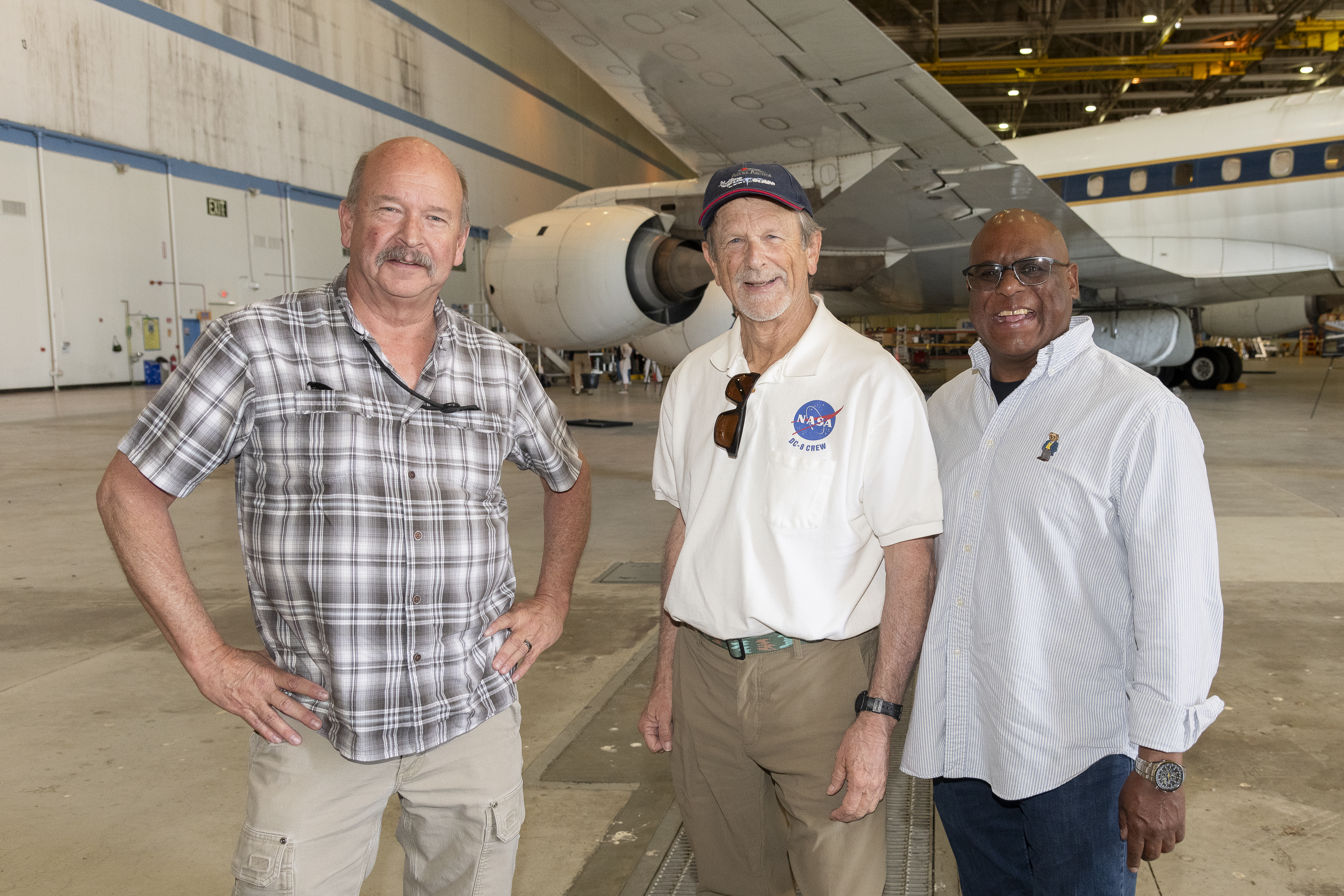 Rocky Radcliff, Kevin Hall, and Herman “Chico” Rijfkogel stand in front of NASA’s DC-8 aircraft at the agency’s Armstrong Flight Research Center Building 703 in Palmdale, California. On May 2, 2024, NASA personnel, friends, and family celebrated the DC-8 staff, aircraft, and science campaigns.