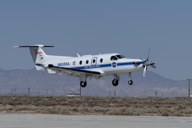 Equipped with state-of-the-art technology to test and evaluate communication, navigation, and surveillance systems NASA’s Pilatus PC-12 performs touch-and-go maneuvers over a runway at NASA’s Armstrong Flight Research Center in Edwards, California on Sept. 23, 2024. Researchers will use the data to understand Automatic Dependent Surveillance-Broadcast (ADS-B) signal loss scenarios for air taxi flights in urban areas. To prepare for ADS-B test flights pilots and crew from NASA Armstrong and NASA’s Glenn Research Center in Cleveland, ran a series of familiarization flights. These flights included several approach and landings, with an emphasis on avionics, medium altitude air-work with steep turns, slow flight and stall demonstrations.