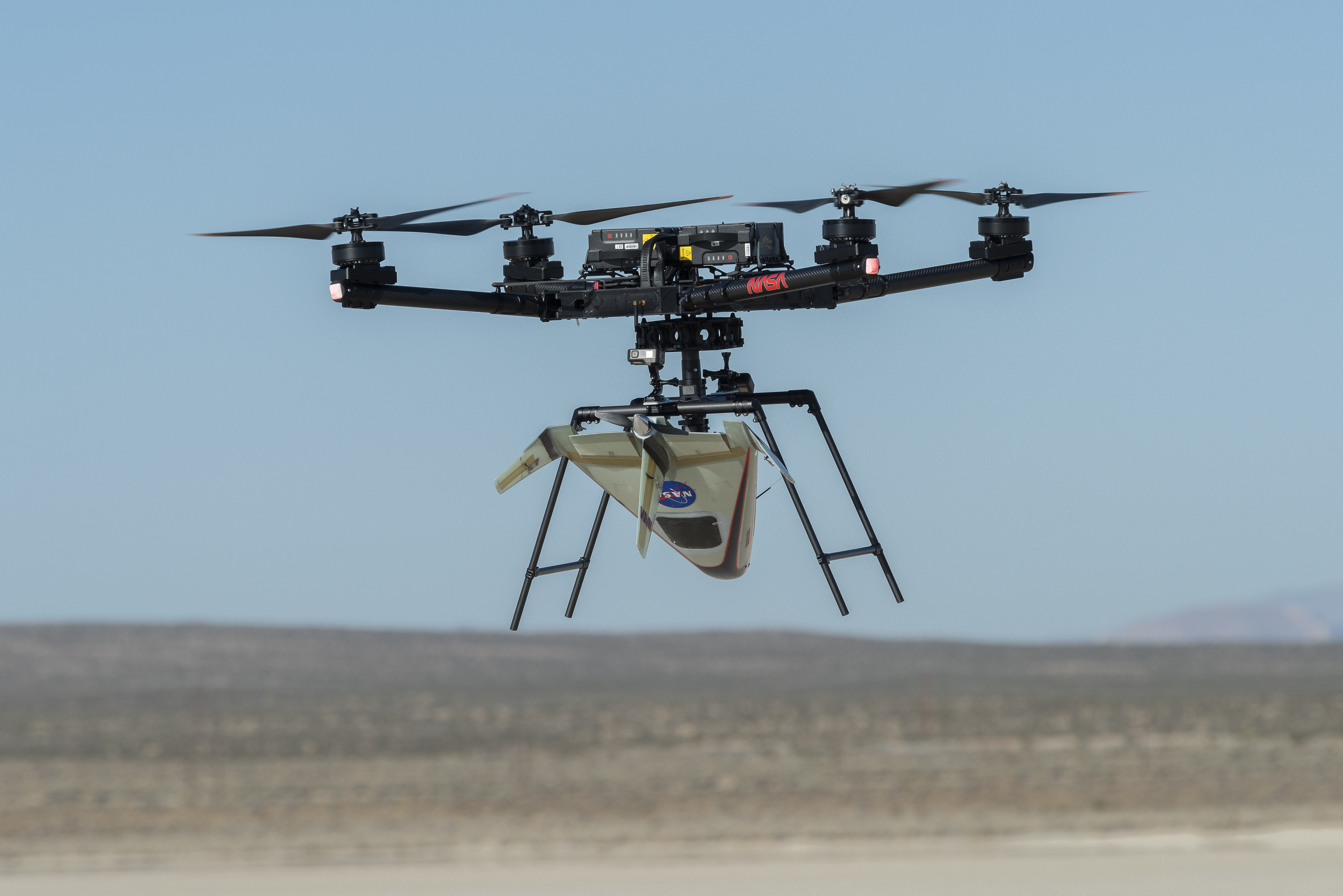 An atmospheric probe model attached upside down to a host quad rotor remotely piloted aircraft lifts off on Oct. 22, 2024. The quad rotor aircraft released the probe above Rogers Dry Lake, a flight area adjacent NASA’s Armstrong Flight Research Center in Edwards, California. The probe was designed and built at the center.