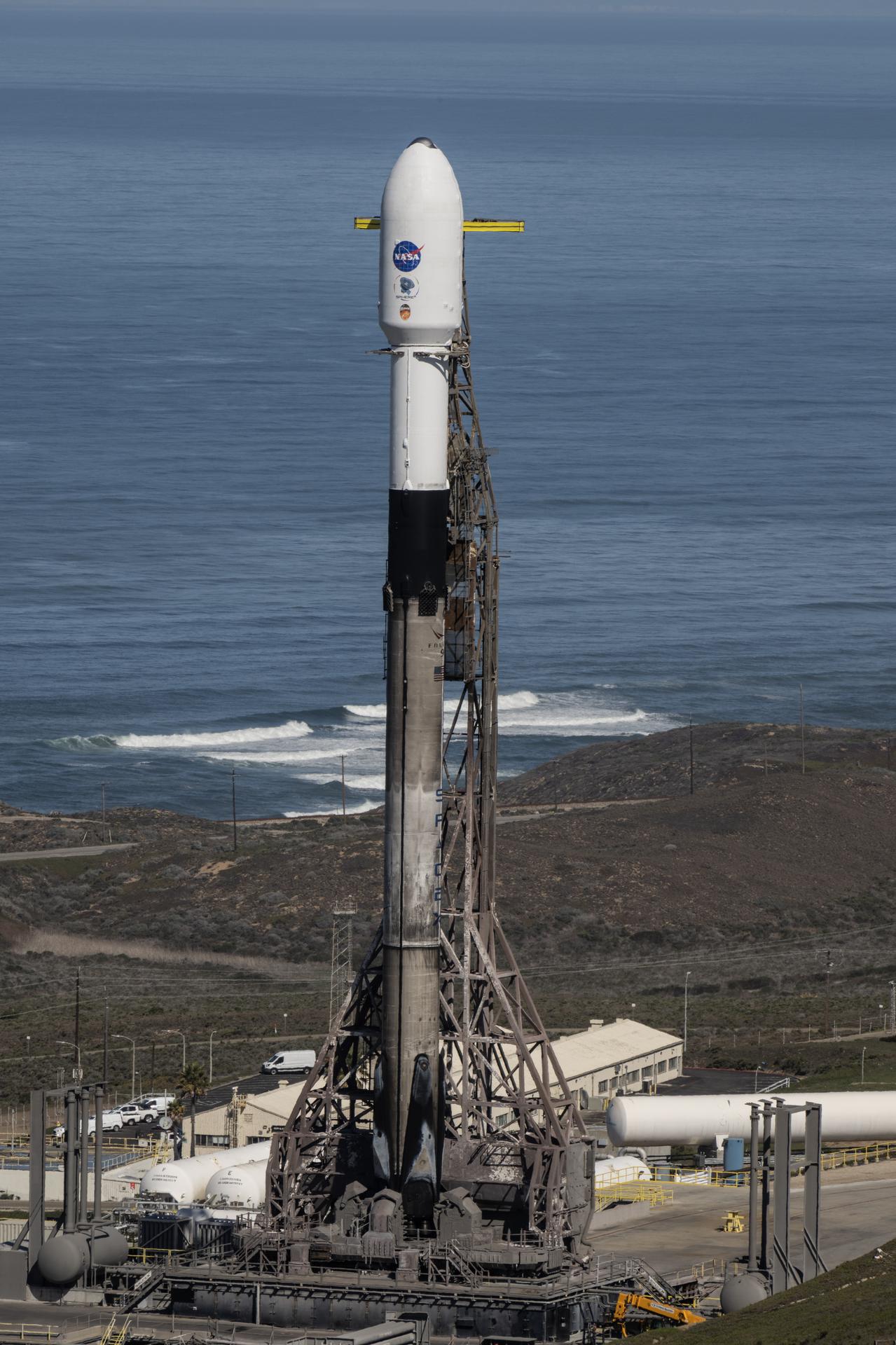 A SpaceX Falcon 9 rocket, carrying NASA’s SPHEREx (Spectro-Photometer for the History of the Universe, Epoch of Reionization and Ices Explorer) observatory and PUNCH (Polarimeter to Unify the Corona and Heliosphere) satellites, is vertical at Space Launch Complex 4 East from Vandenberg Space Force Base in California on Saturday, March 8, 2025. SPHEREx will use its telescope to provide an all-sky spectral survey, creating a 3D map of the entire sky to help scientists investigate the origins of our universe. PUNCH will study origins of the Sun’s outflow of material, or the solar wind, capturing continuous 3D images of the Sun’s corona and the solar wind’s journey into the solar system.