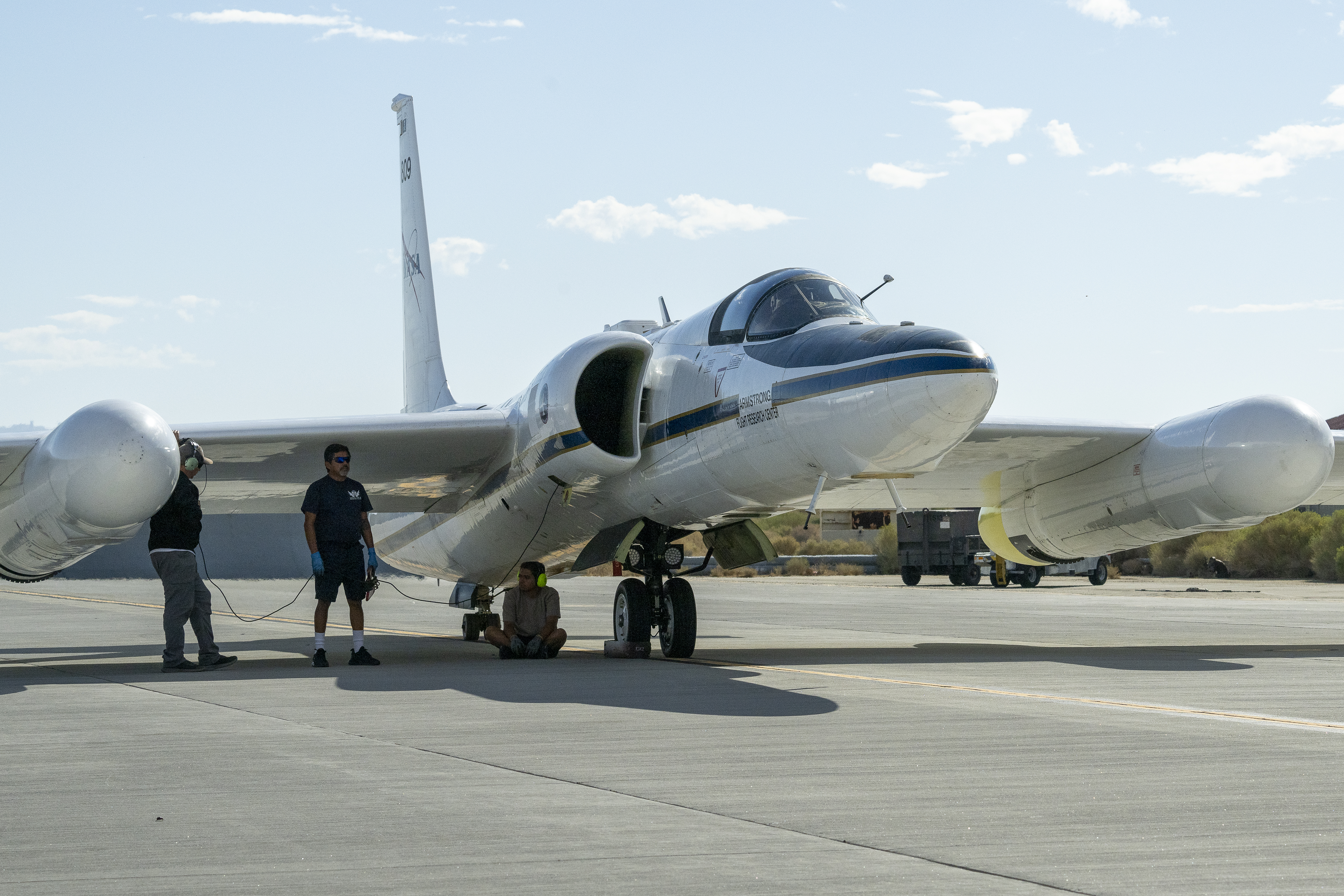 Crew members prepare NASA Armstrong Flight Research Center’s ER-2 aircraft for flight at Edwards, California, on Tuesday, Sept. 23, 2025, in support of the Geological Earth Mapping Experiment (GEMx). The high-altitude science aircraft operates between 20,000 and 70,000 feet. For this mission, pilots flew at approximately 65,000 feet, requiring them to wear specially designed pressure suits.