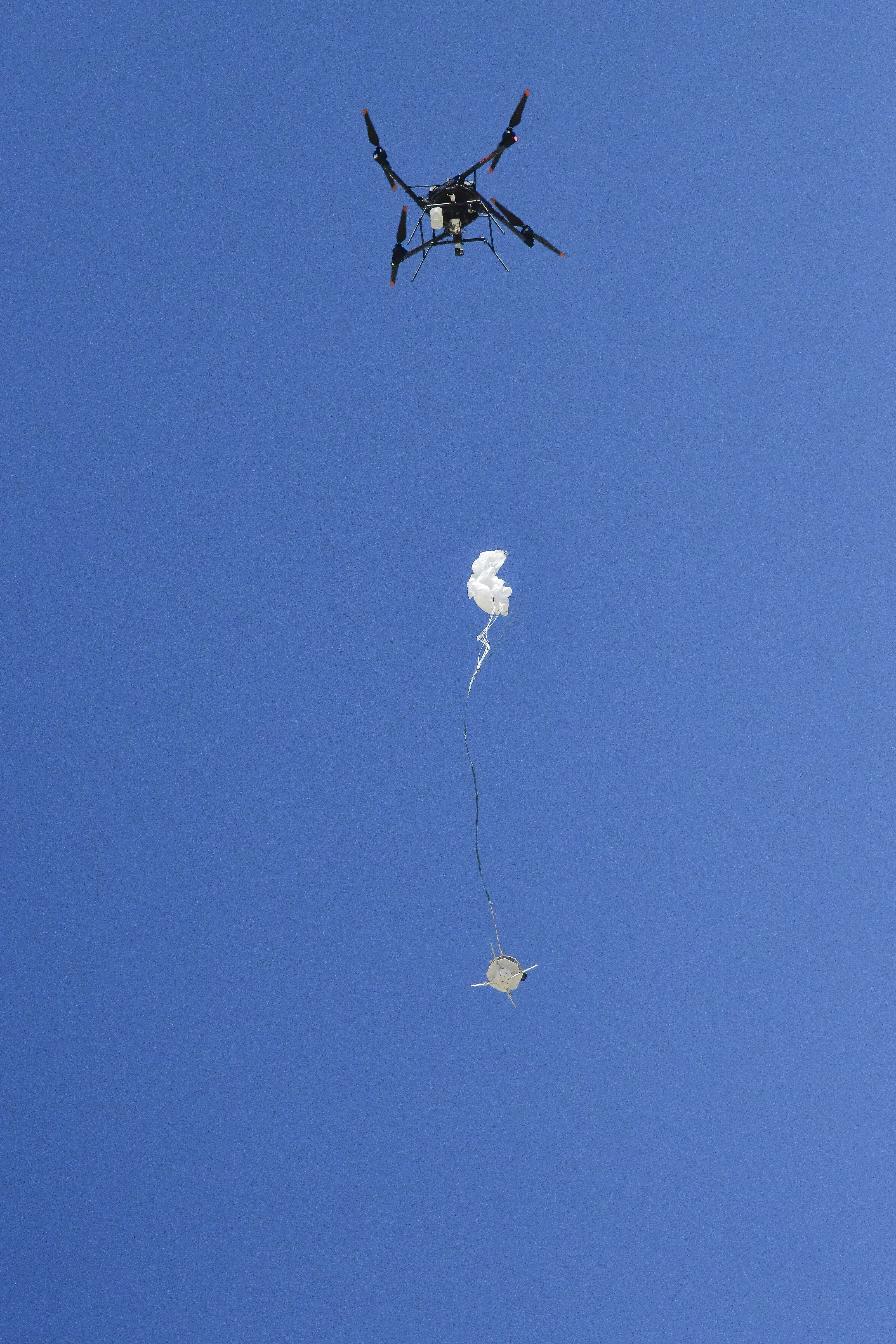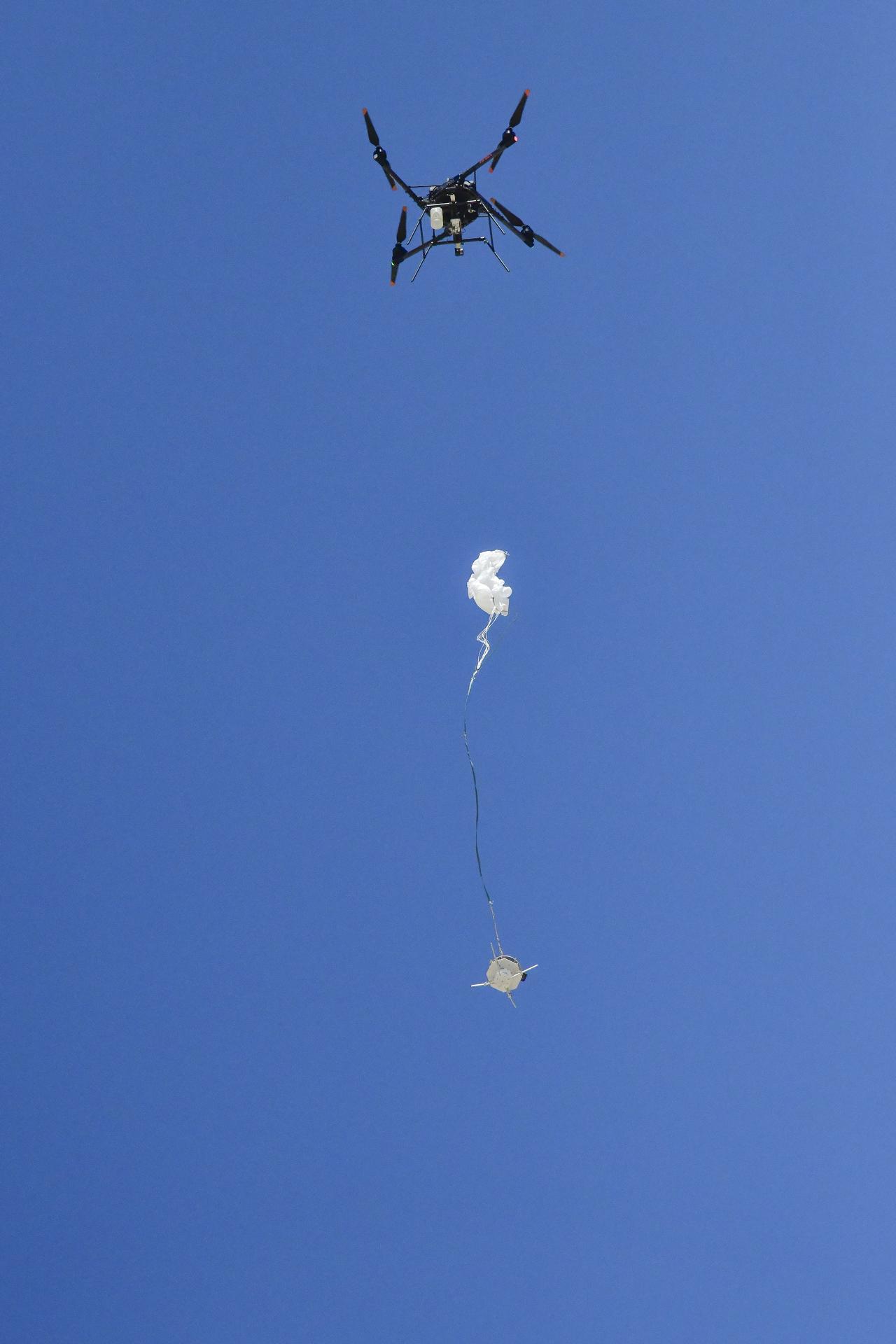 An Alta X drone air launches the Enhancing Parachutes by Instrumenting the Canopy test experiment on June 4, 2025, at NASA’s Armstong Flight Research Center in Edwards, California. NASA researchers are developing technology to make supersonic parachutes safer and more reliable for delivering science instruments and payloads to Mars.