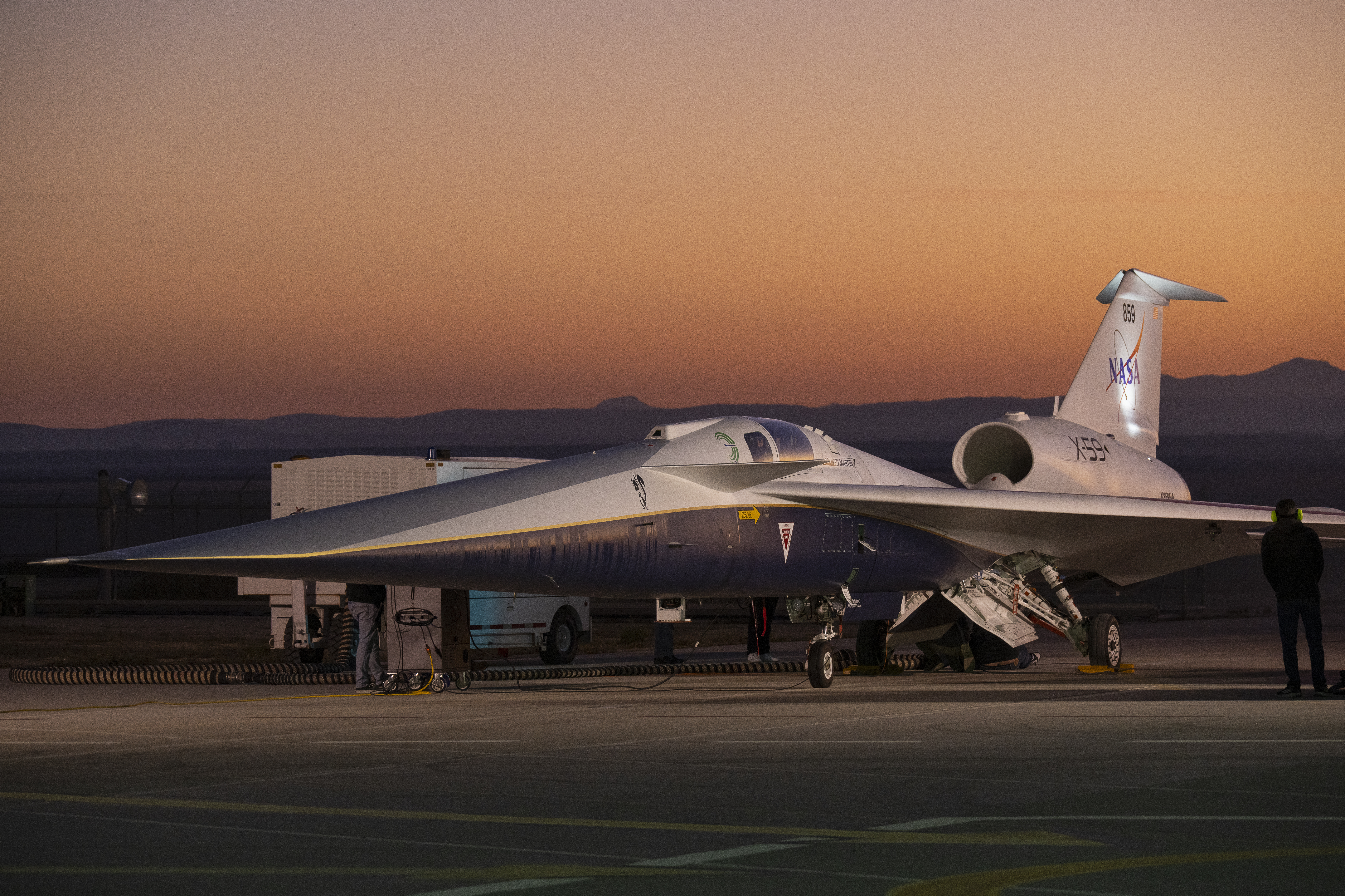 NASA’s X-59 quiet supersonic research aircraft sits on the ramp during engine run testing on Thursday, March 12, 2026, at NASA’s Armstrong Flight Research Center in Edwards, California. Engine runs are one of the final tests before the aircraft is ready for its second flight. The data collected from the aircraft during upcoming flight tests could help inform future regulations for commercial supersonic travel over land.
