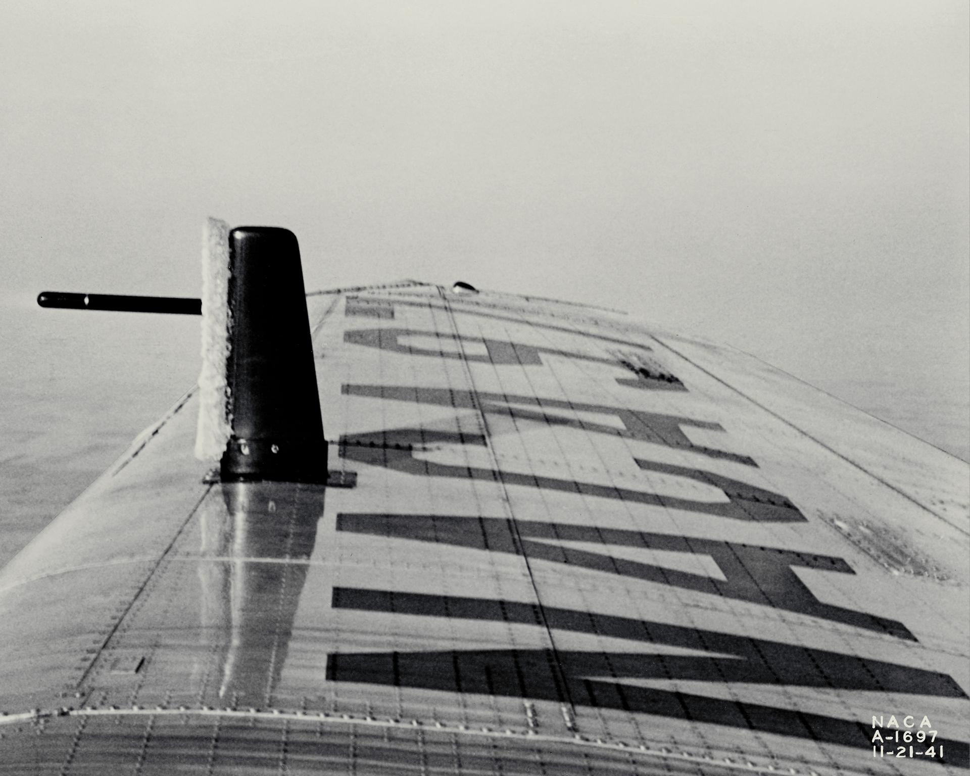 NACA photographer Ice Reearch being conducted at NACA Ames Aeronautical Laboratory on a Lockheed 12-A, NACA 97; test #4, ice on tell-tale strut in flight