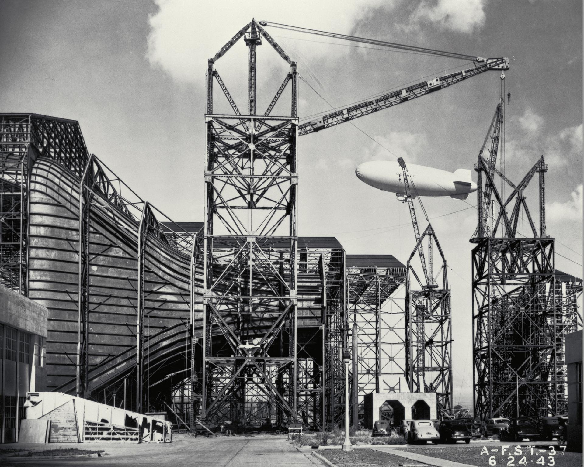 Construction of the Ames Full-Scale 40x80ft Wind tunnel. - side view of entrance cone, blimp in background