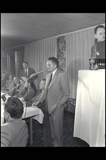 Harry J. Goett with Larry Clousing (seated next to him at head table) during William McAvoy (seat at middle of table) testimonial dinner. Publication: Atmosphere of Freedom; 60 yrs. of Ames - NASA SP