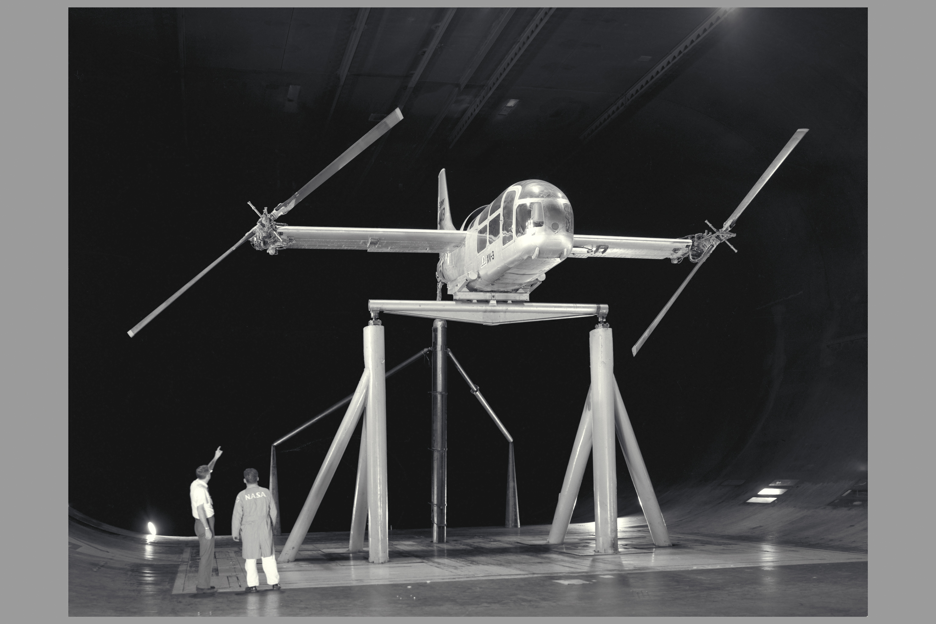 XV-3 in Ames Reseach Center 40x80ft wind tunnel with K. Edenborough and B. Ramsey, engineers Published in The History of the XV-15 Tilt Rotor Research Aircraft (from Concept to Flight NASA SP-2000-4517)