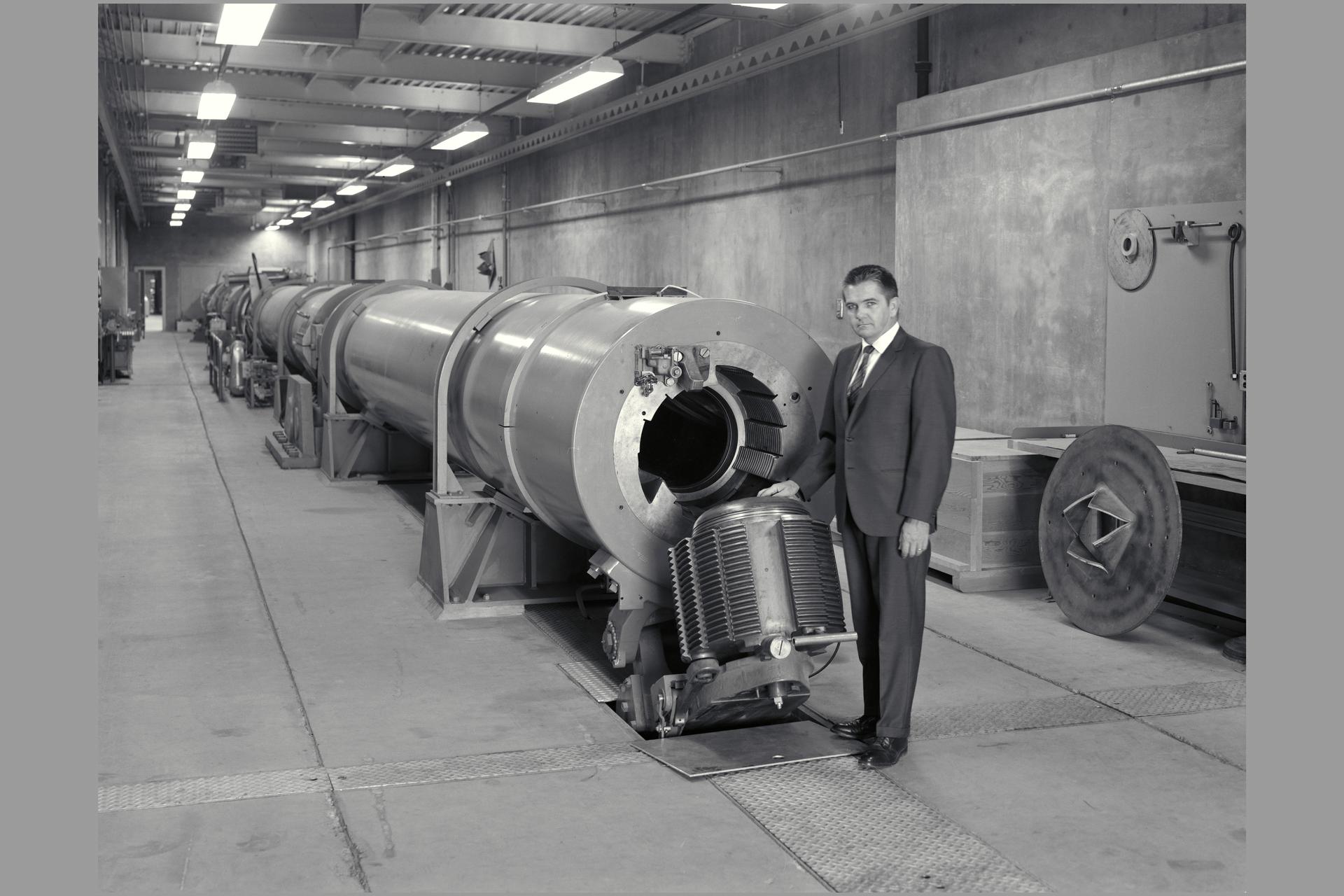 Thomas N. Canning, Hypersonic Free-Flight Branch Chief, inspects breech of the counter flow section of gun. Hypersonic Free-Flight Gun.