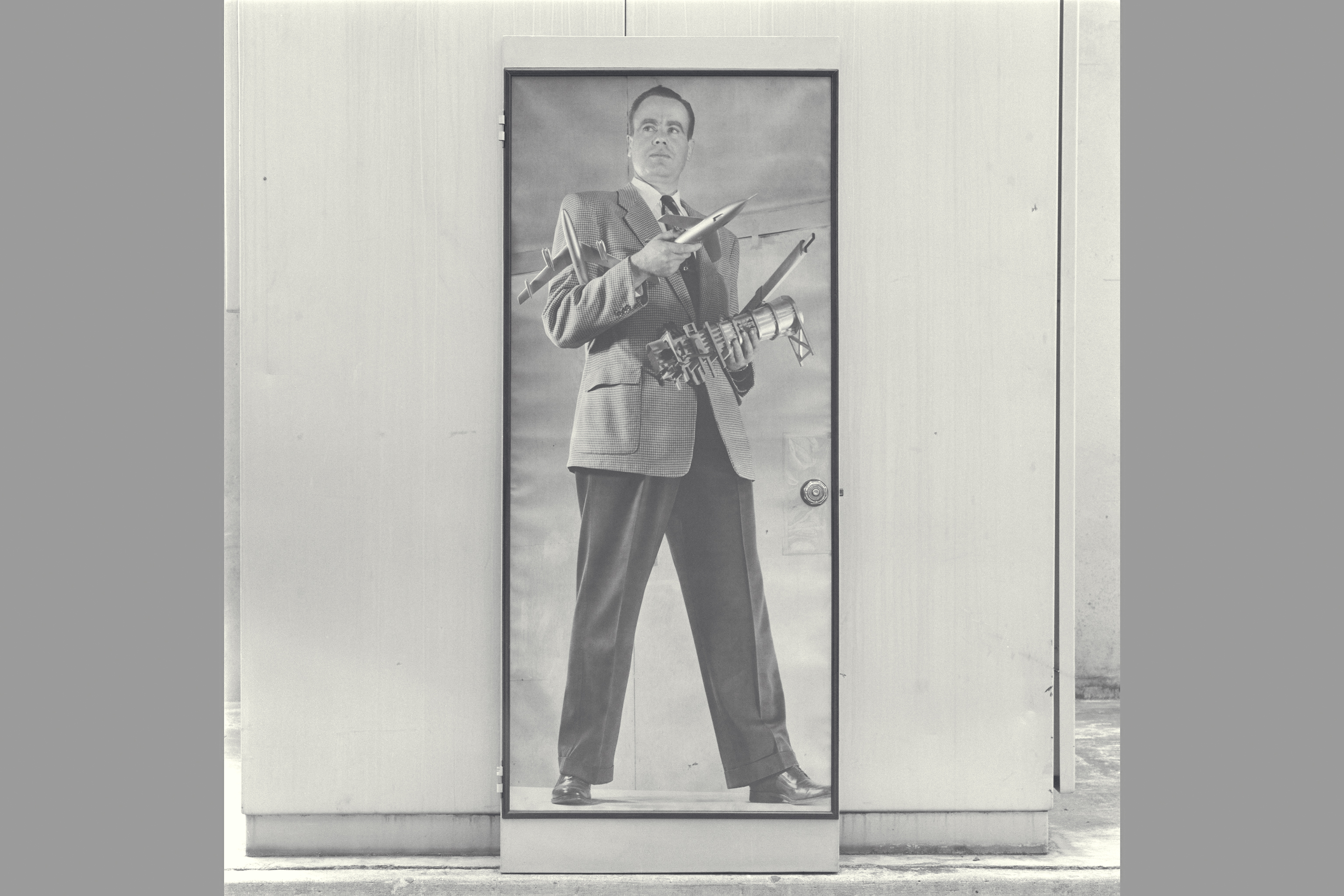 Historical Recruiting poster of Cleve E Voss holding model of B-47, Douglas D-558-2, 6x6ft w.t. & slide rule (on Display at Macy's San Francisco 1947 - 1950 ish) NOTE: Poster recovered from Voss's wife and copied from the (bedroom) door to which it had been adhered.