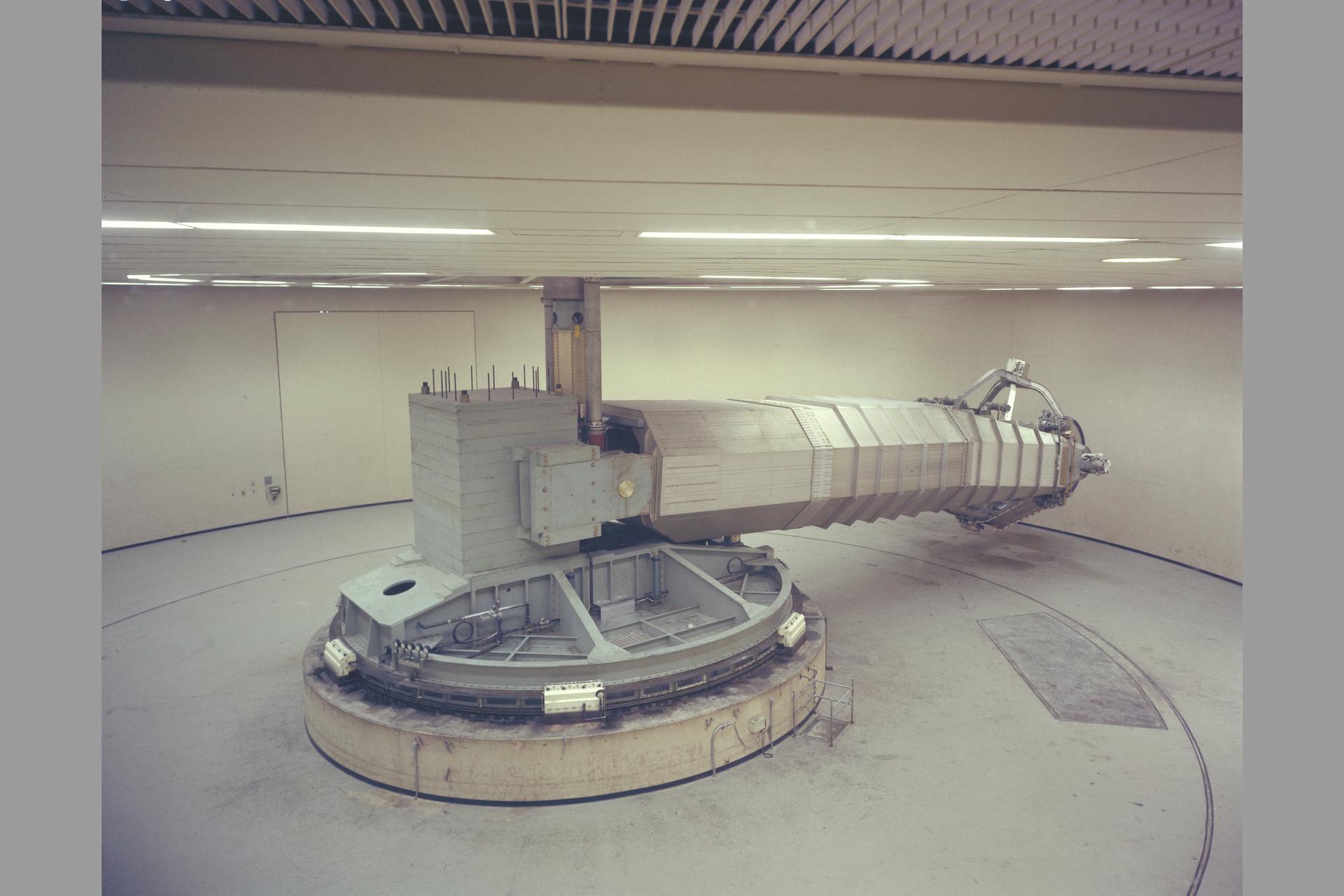 N-243 Flight and Guidance Centrifuge: Is used for spacecraft mission simulations and is adaptable to two configurations. Configuration 1: The cab will accommodate a three-man crew for space mission research. The accelerations and rates are intended to be smoothly applicable at very low value so the navigation and guidance procedures using a high-accuracy, out-the window display may be simulated. Configuration 2: The simulator can use a one-man cab for human tolerance studies and performance testing. Atmosphere and tempertaure can be varied as stress inducements. This simlator is operated closed-loop with digital or analog computation. It is currently man-rated for 3.5g maximum.