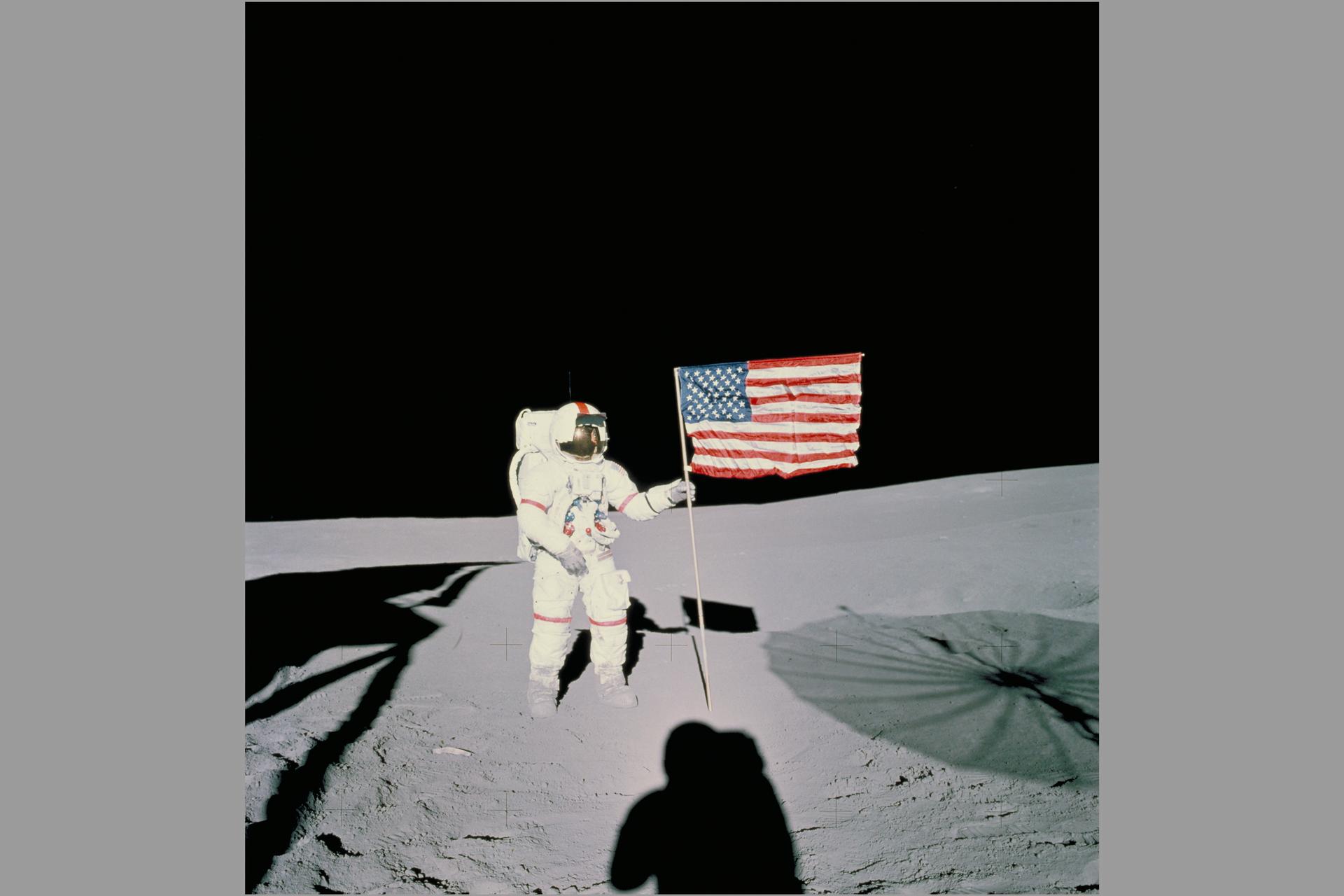 ASTRONAUT ALAN B. SHEPARD STANDING WITH AMERICAN FLAG ON LUNAR SURFACE