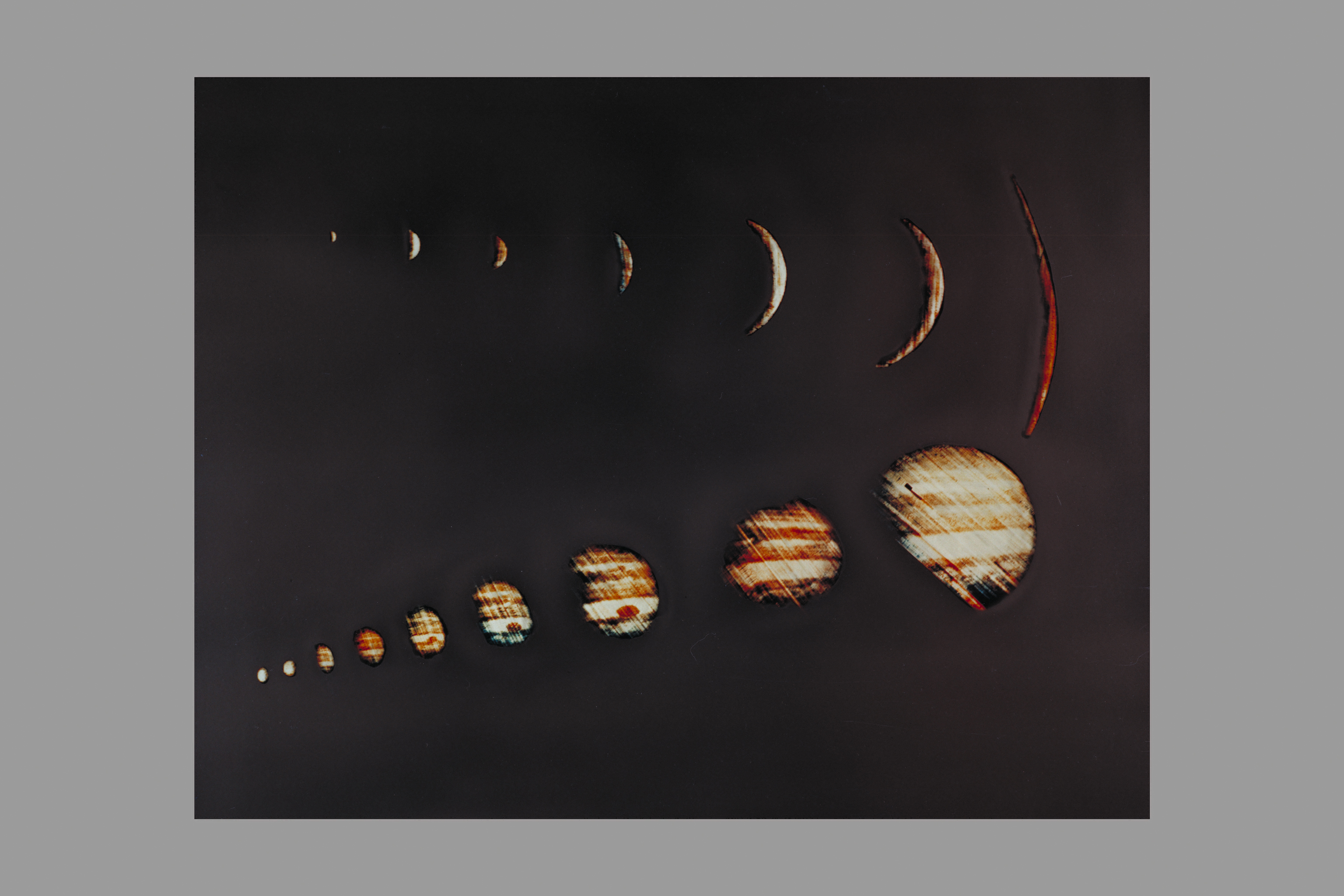 Composite Pioneer 10 imagery Excitement rose as the PICS displayed images of Jupiter of ever-increasing size as Pioneer 10 plunged at high speed toward its closest approach to the planet. The most dramatic moment was perhaps after closest approach and after the spacecraft has been hidden behind Jupiter. PICS (Pioneer Image Converter System) began to show a few spots on the screens, which gradually built up into a very distorted crescent-shaped Jupiter. 'Sunrise on Jupiter,' exclaimed an experimenter excitedly. 'We've made it safely through periapsis.' Subsequent PICS images were of a crescent Jupiter gradually decreasing in size as the spacecraft sped away out of the Jovian system. Note: used in NASA SP-349 'Pioneer Odyssey - Encounter with a Giant' fig. 5-15 and SP-446 ' Pioneer - First to Jupiter, Saturn, and Beyond' fig. 5-16.